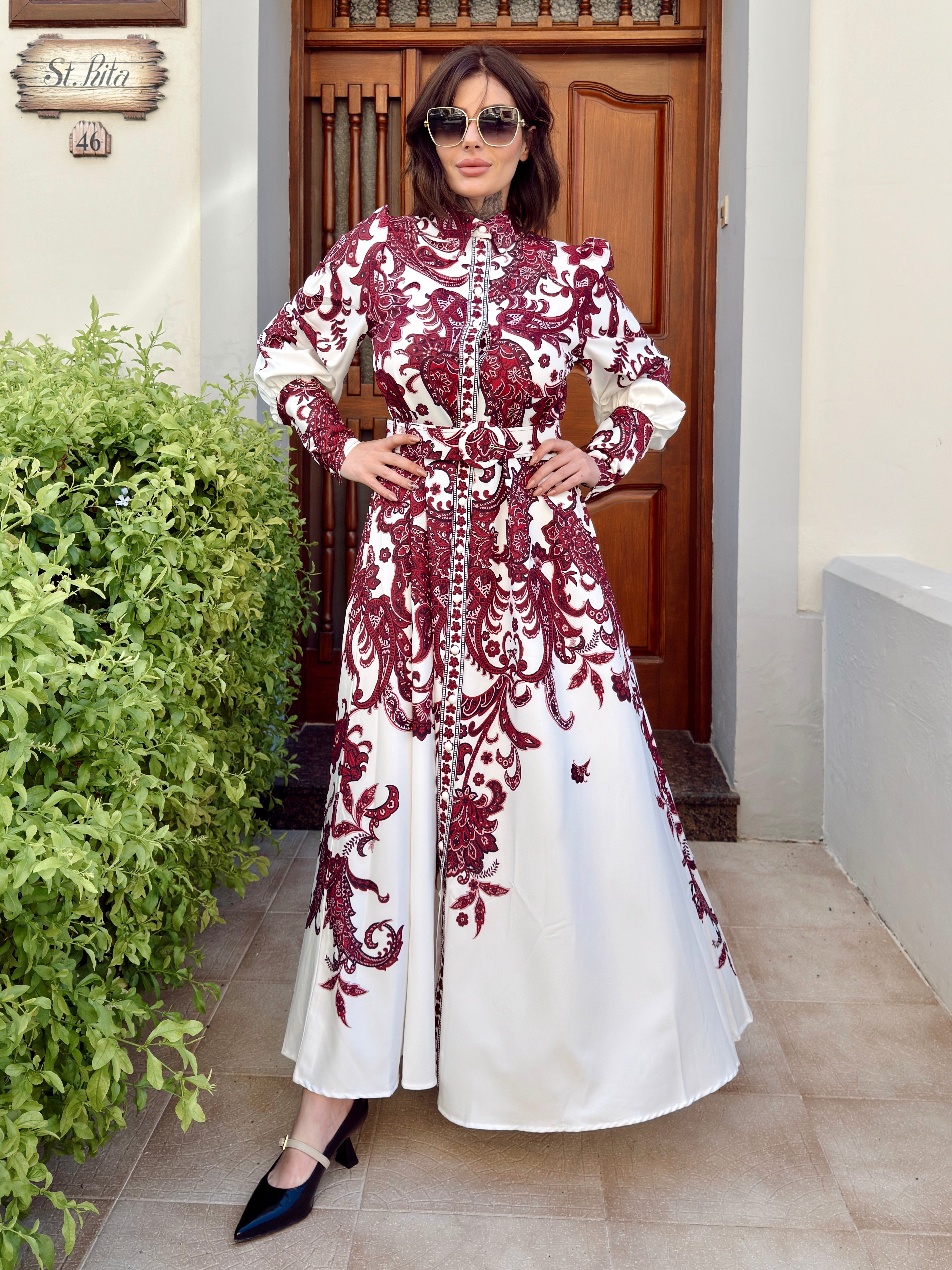 Majestic maxi shirt dress in ivory with rich crimson baroque-inspired detailing. Designed with structured shoulders, a belted waist, and flowing silhouette, this statement piece exudes elegance