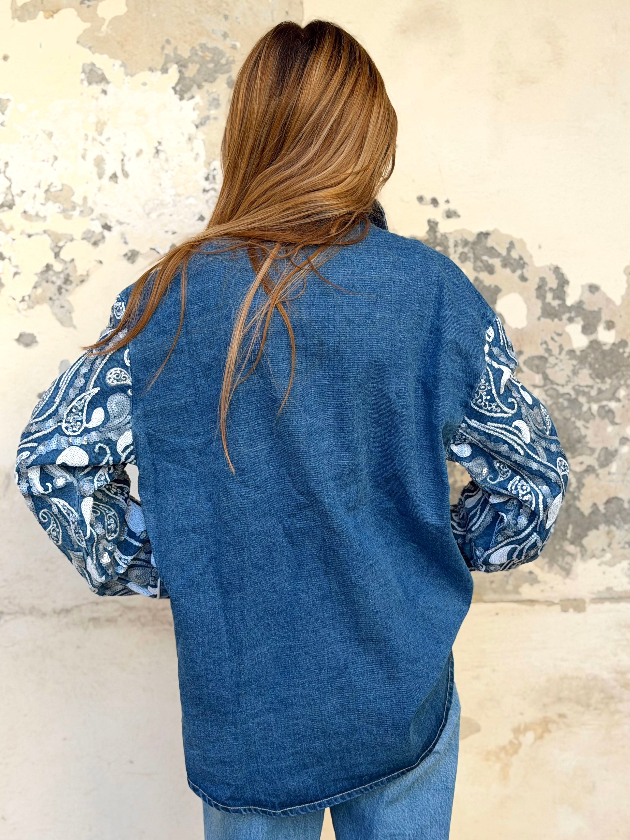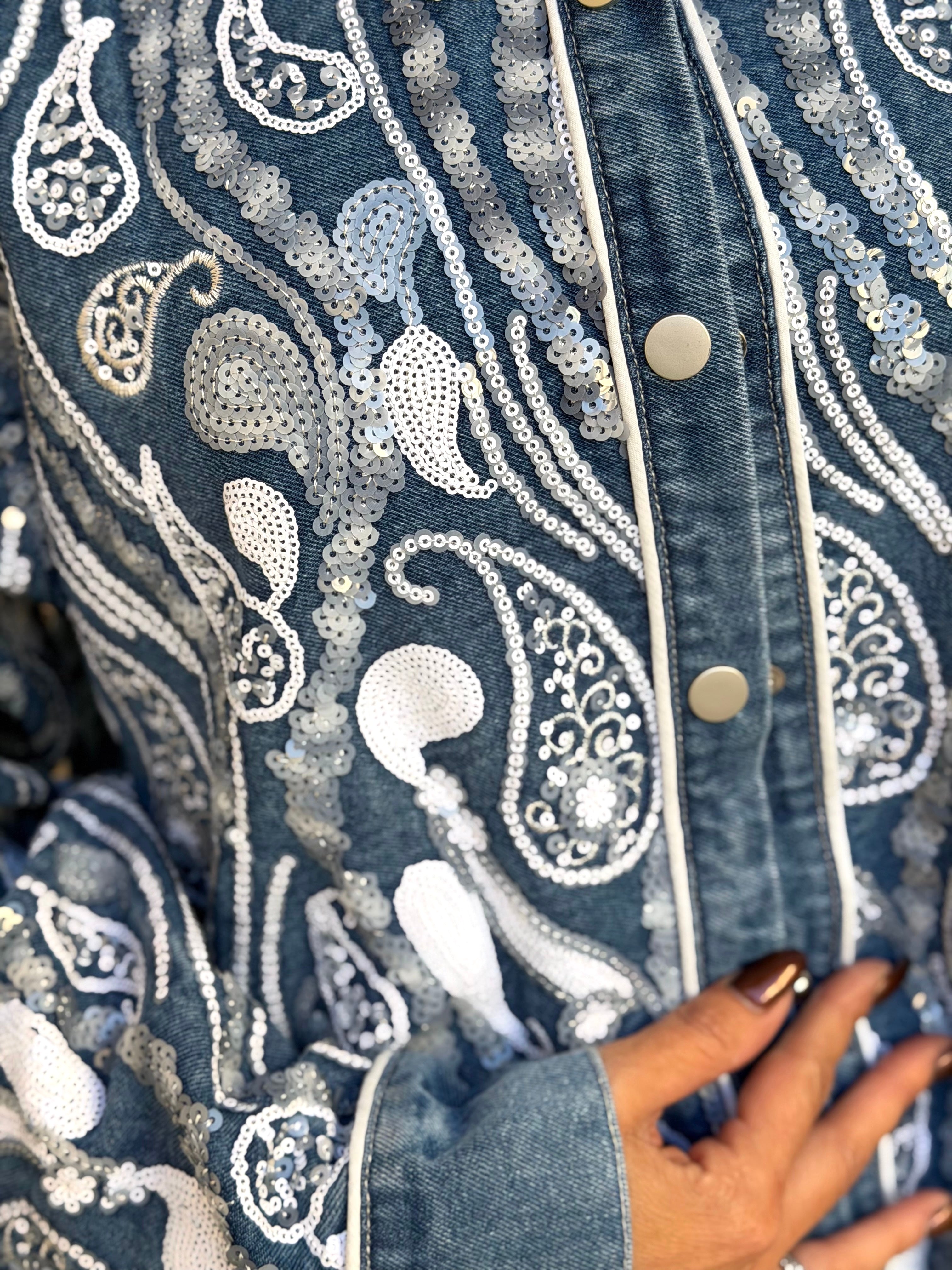 Eye-catching denim shacket featuring an intricate paisley embroidery design in contrasting tones. Crafted in a relaxed silhouette with snap button fastening — a statement layering piece that adds effortless sophistication to any casual look.