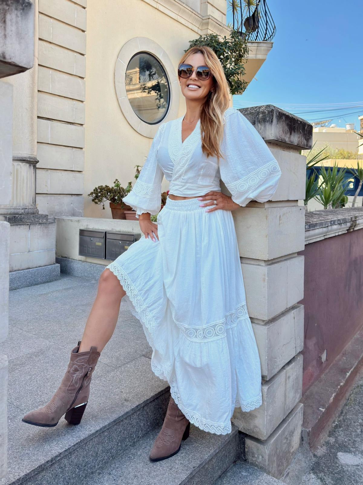 White two-piece set featuring a tie-front crop top with puff sleeves and intricate lace trim, paired with a flowing tiered maxi skirt.