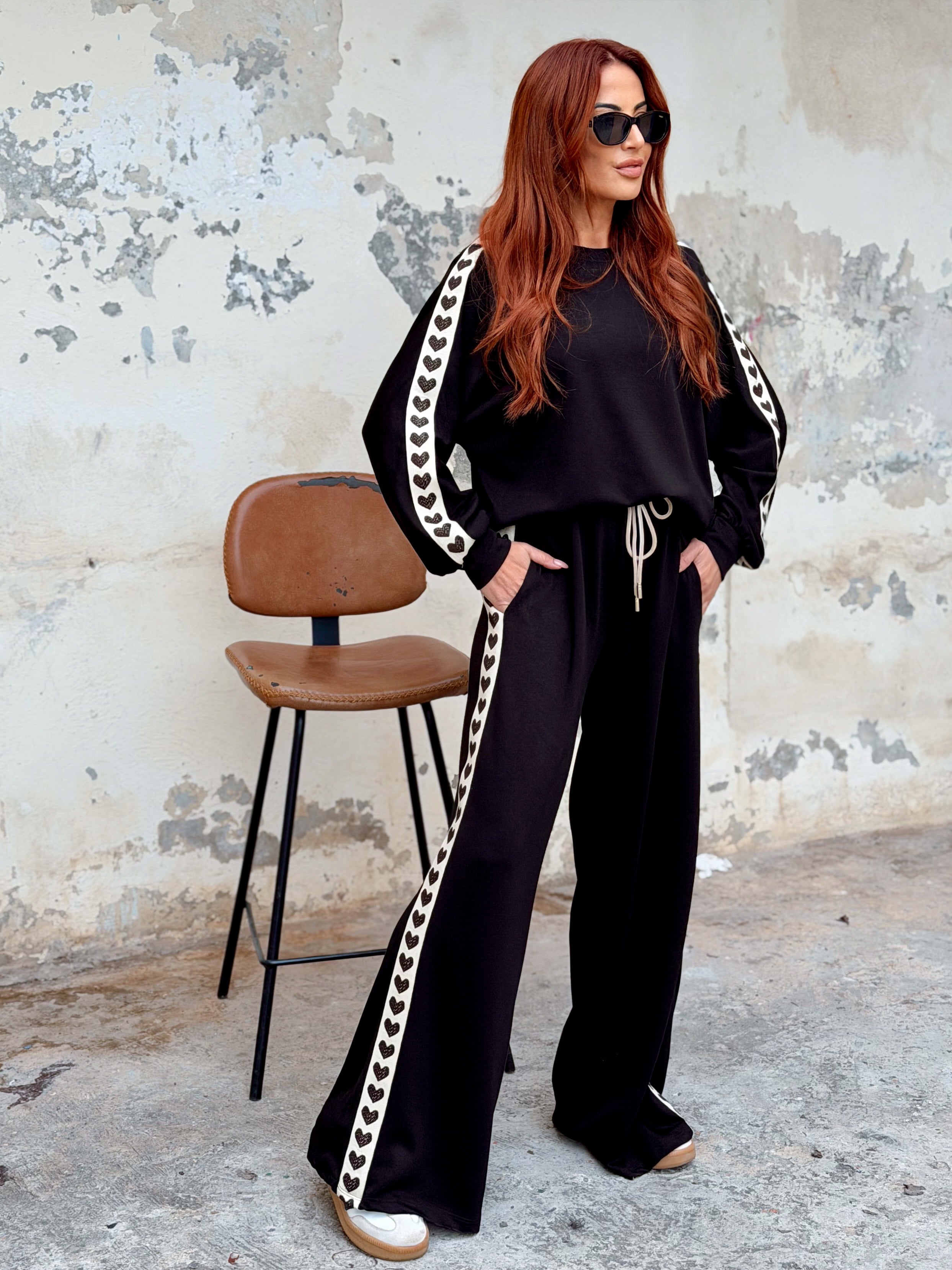 A chic statement tracksuit featuring a relaxed sweatshirt and wide-leg trousers, finished with signature heart tape detailing along the sleeves and sides. Effortlessly comfortable with a playful, elevated edge.