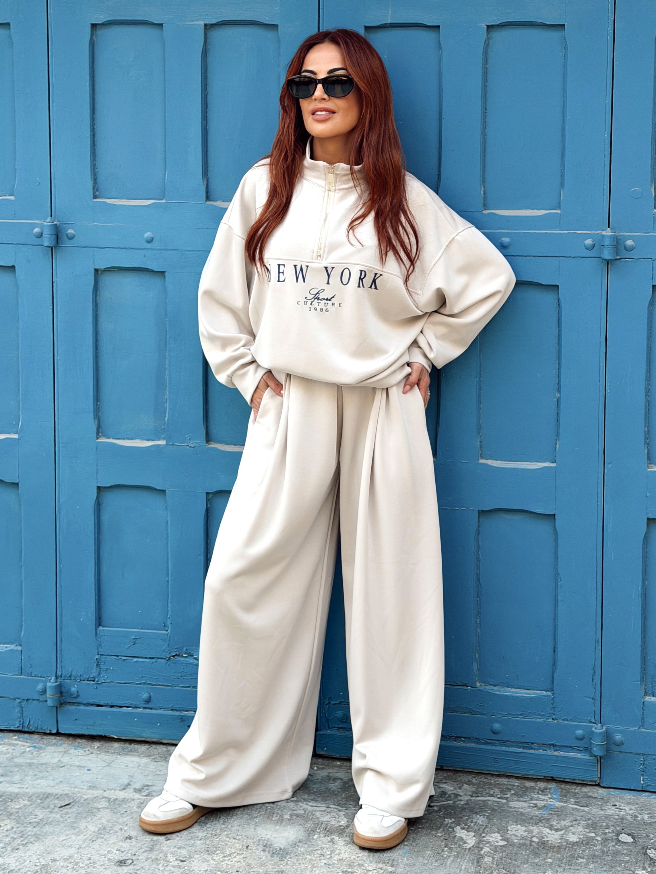 An ultra-soft tracksuit featuring a relaxed half-zip top with luxe gold zipper detailing and fluid wide-leg trousers. Designed for comfort with an effortlessly polished, off-duty feel.
