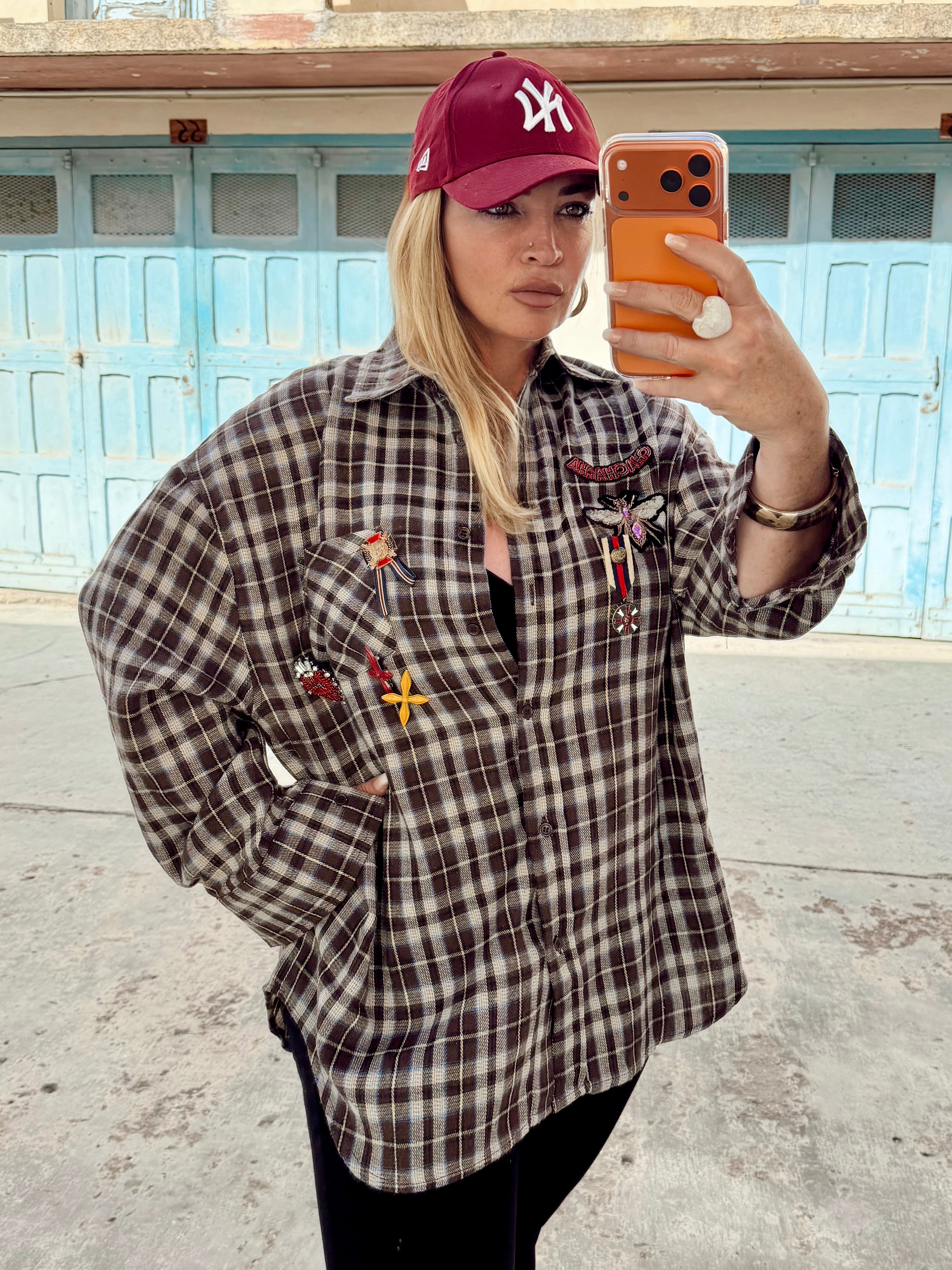An oversize shirt with brooch embellishments