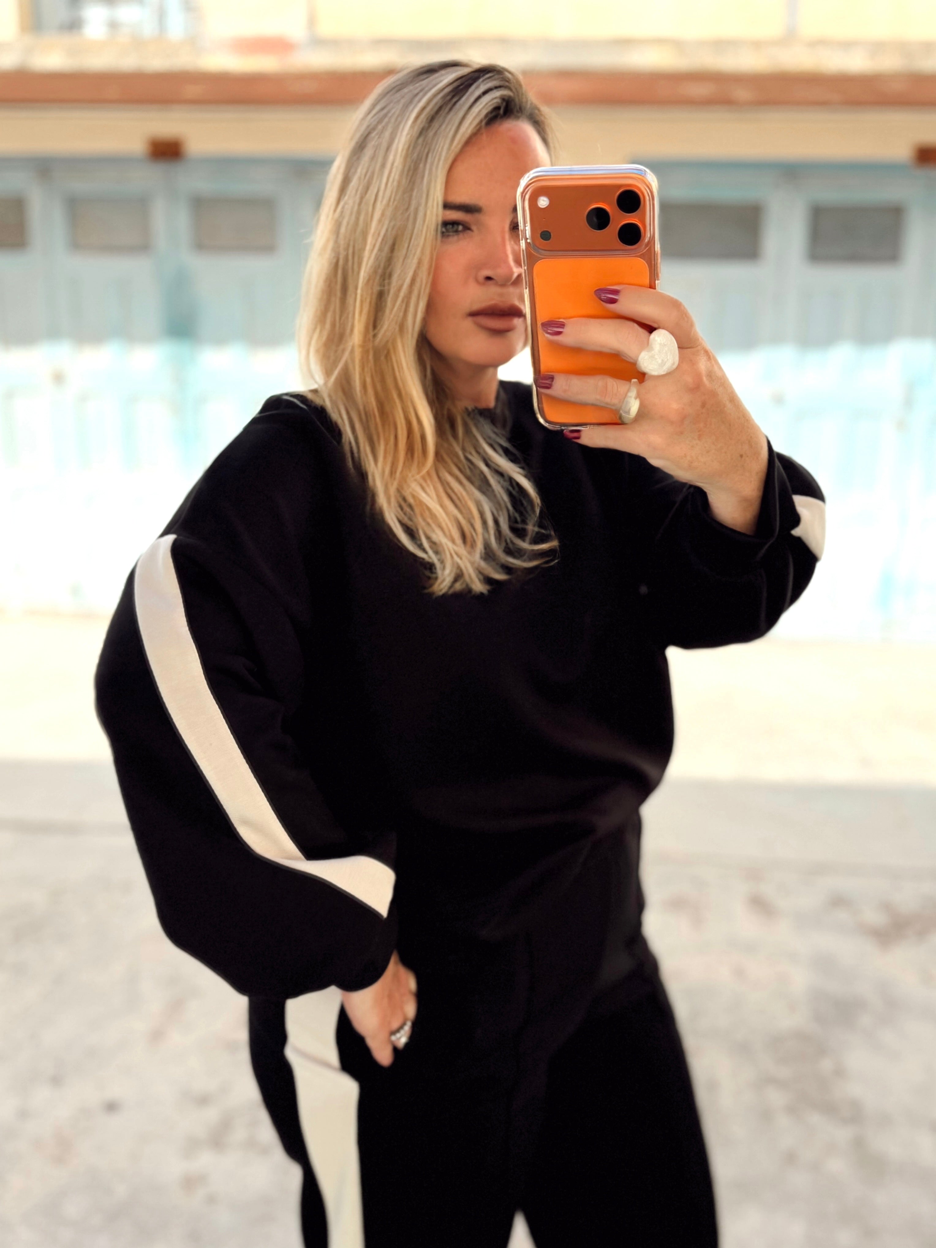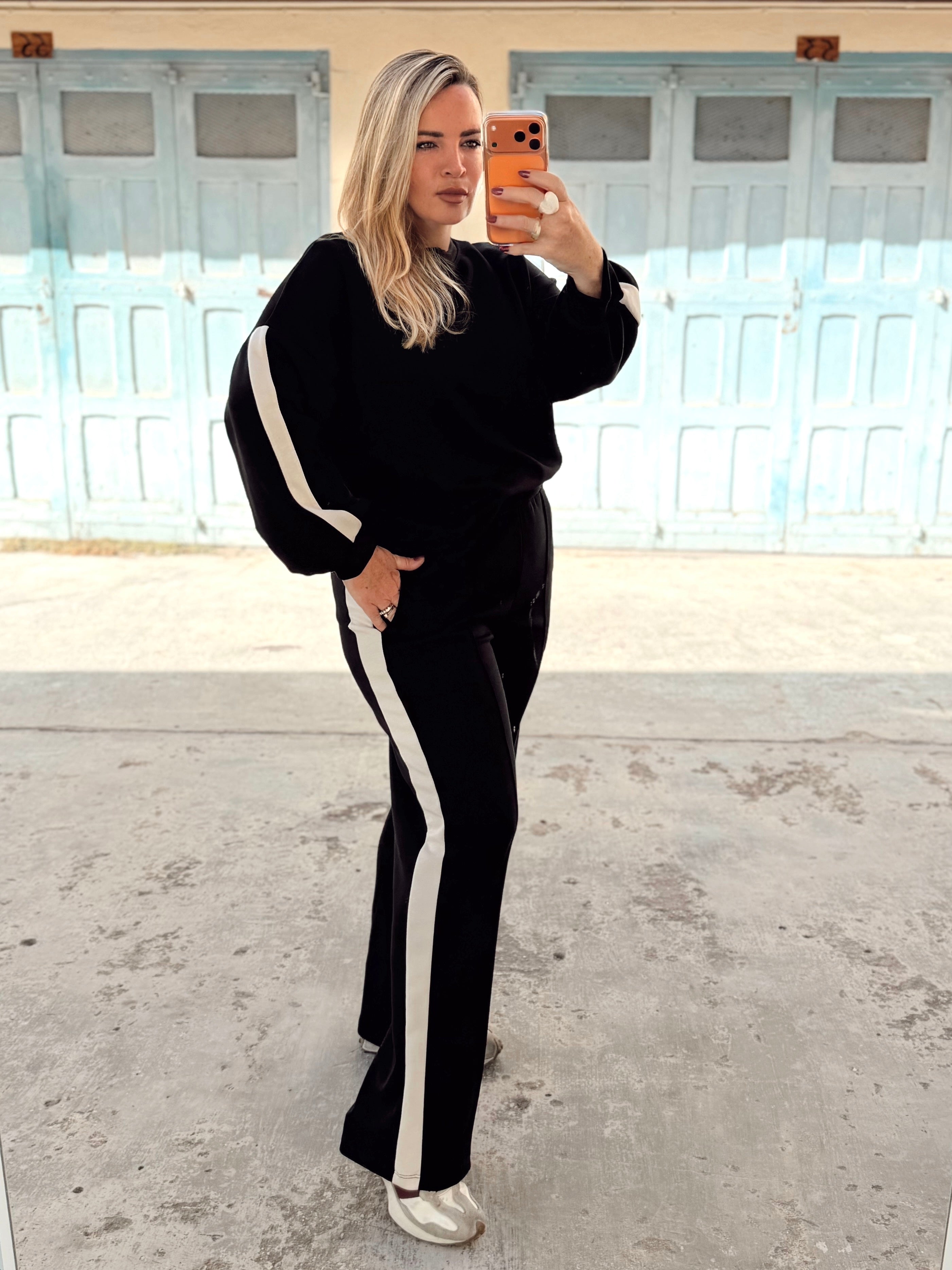 An ultra soft tracksuit with white stripe down the side of the top