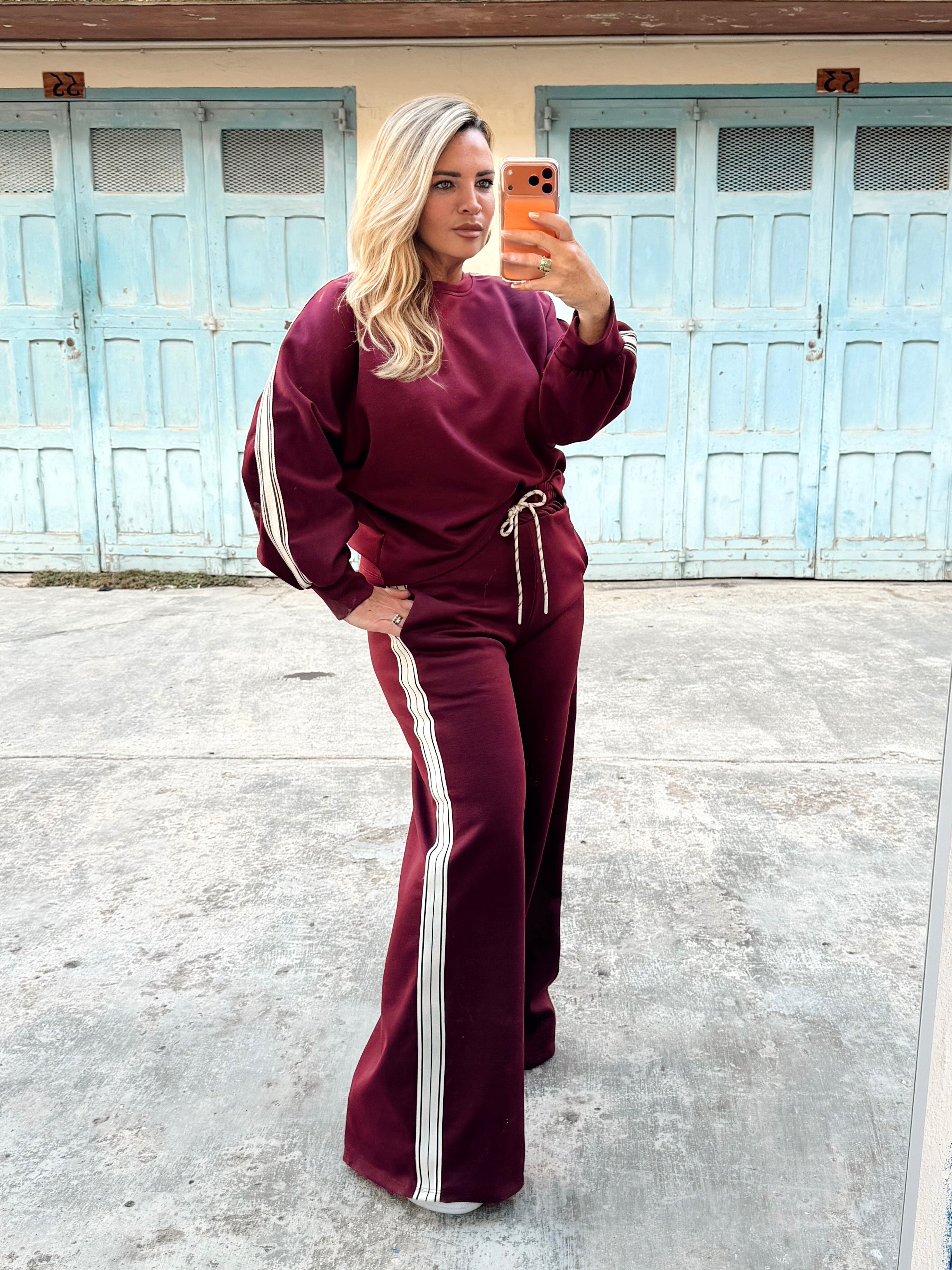 A sophisticated take on sporty chic — this bordeaux tracksuit features contrast side stripes for a lengthening effect, a relaxed-fit sweatshirt, and matching drawstring trousers. Crafted from soft stretch fabric for an effortlessly flattering silhouette and all-day comfort.