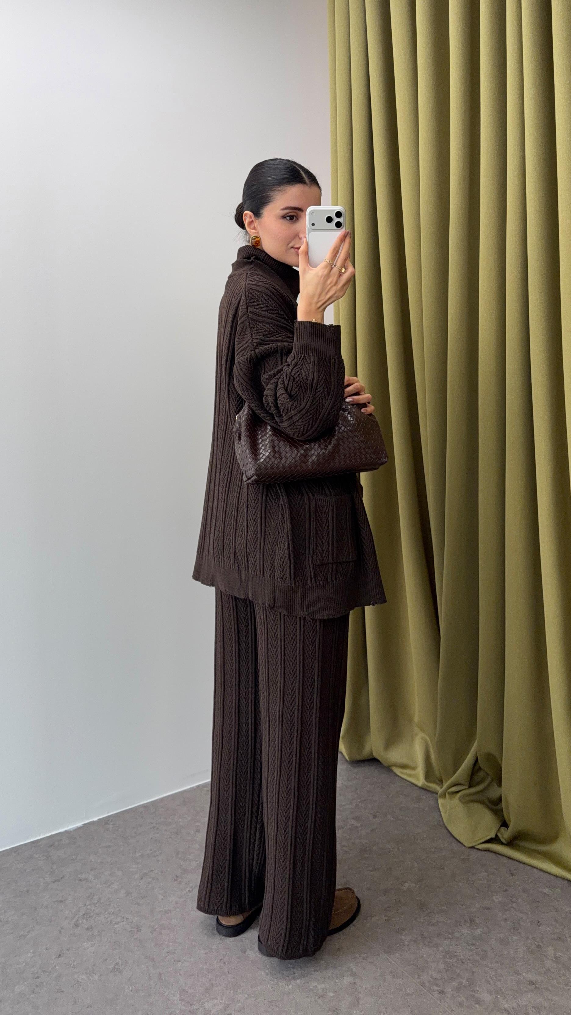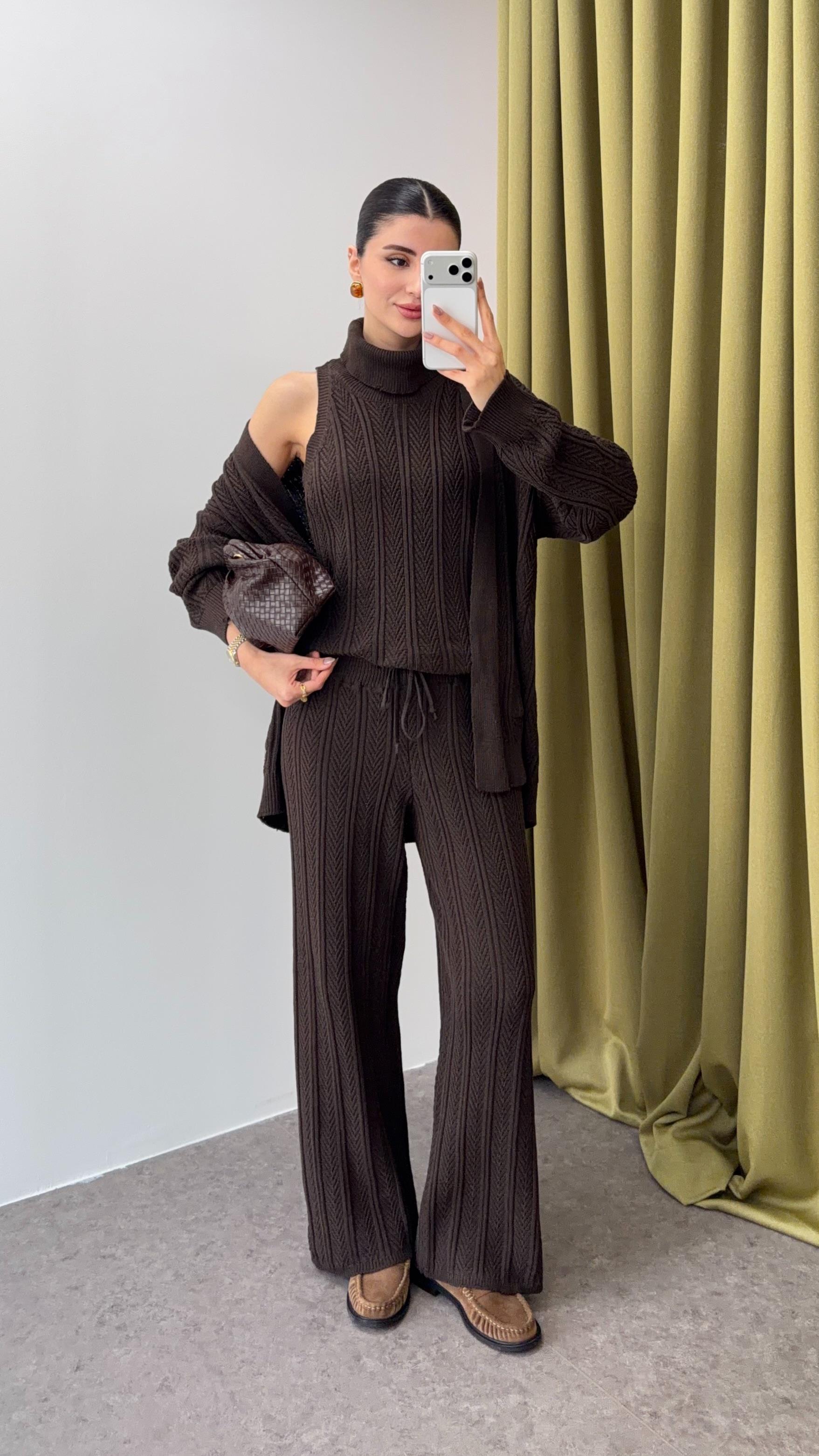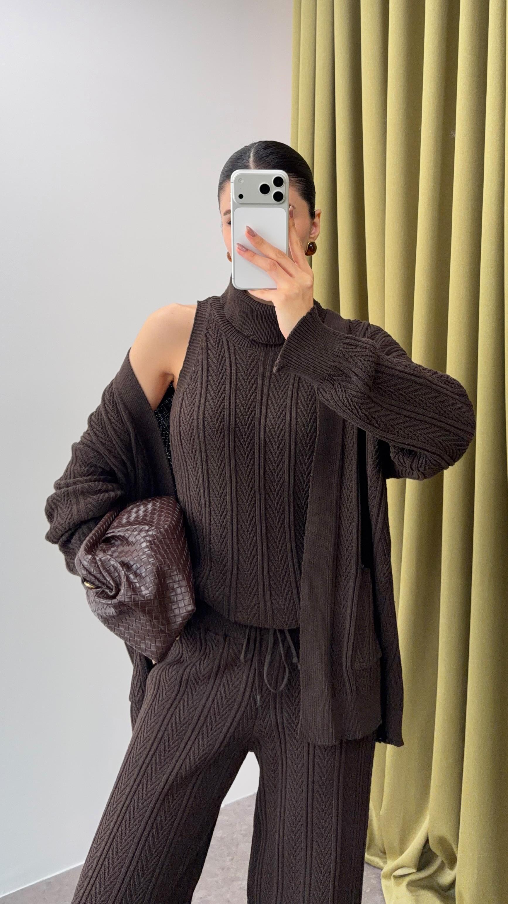 A refined 3-piece knit set designed for effortless elegance. Crafted in a soft herringbone cable knit, it features a sleeveless roll-neck top, relaxed wide-leg trousers with a flattering drape, and a matching slouchy cardigan for layered luxury. Cozy yet polished, this set delivers a timeless silhouette meant for chic everyday comfort.
