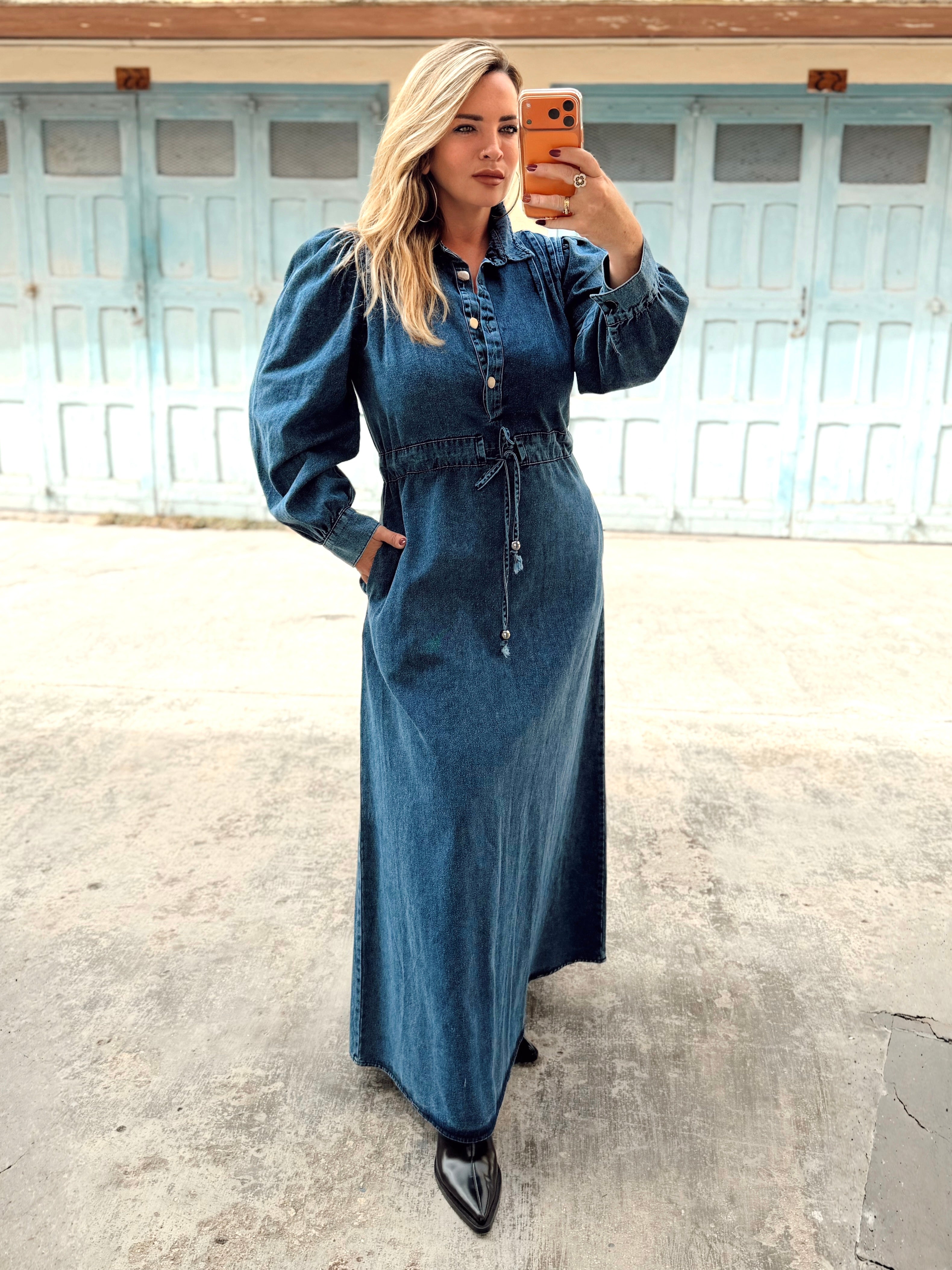 A light-wash denim maxi dress featuring puff sleeves, a buttoned neckline, and a drawstring waist with tassel detail. Feminine yet relaxed — perfect for effortless everyday chic.