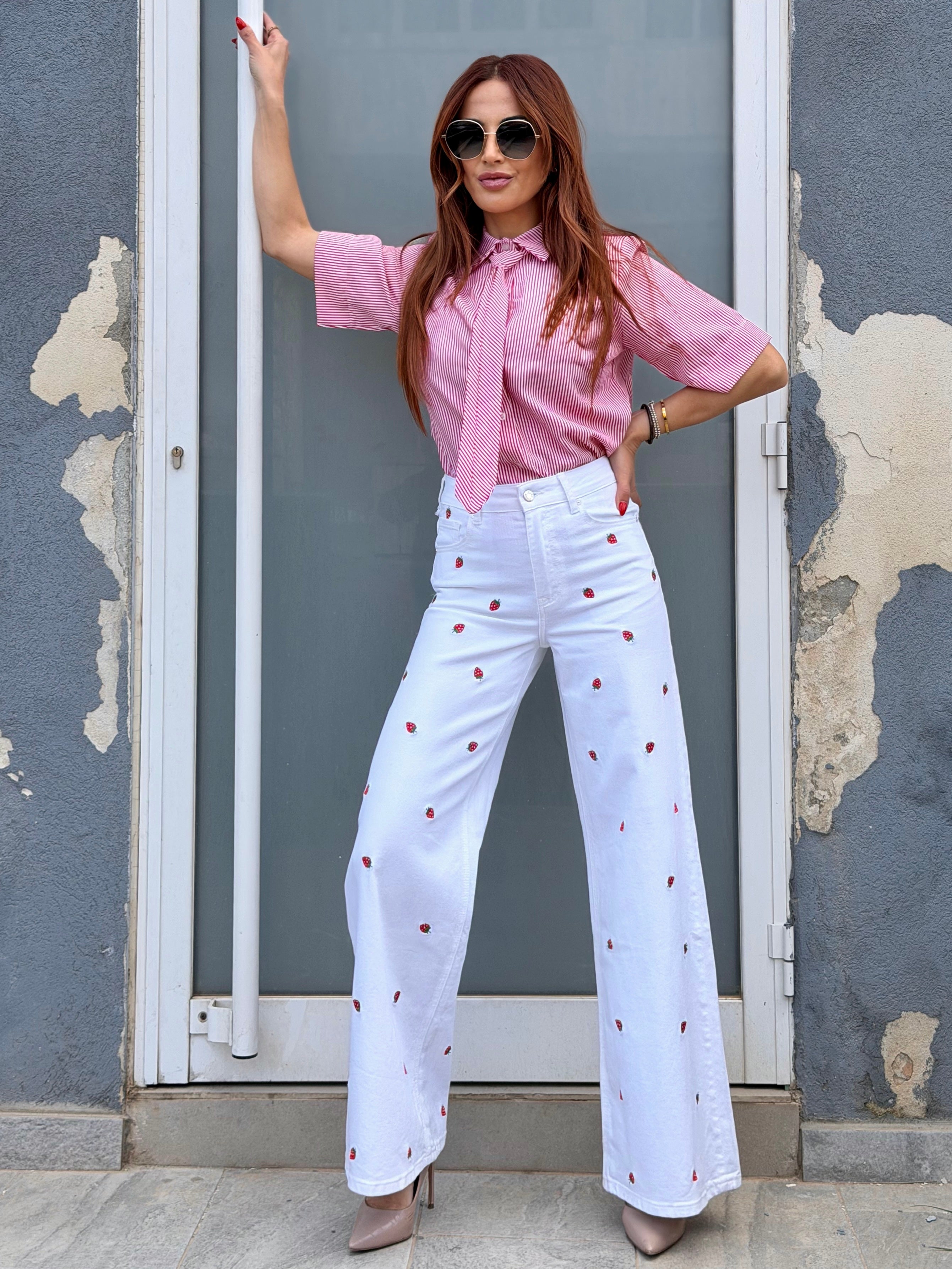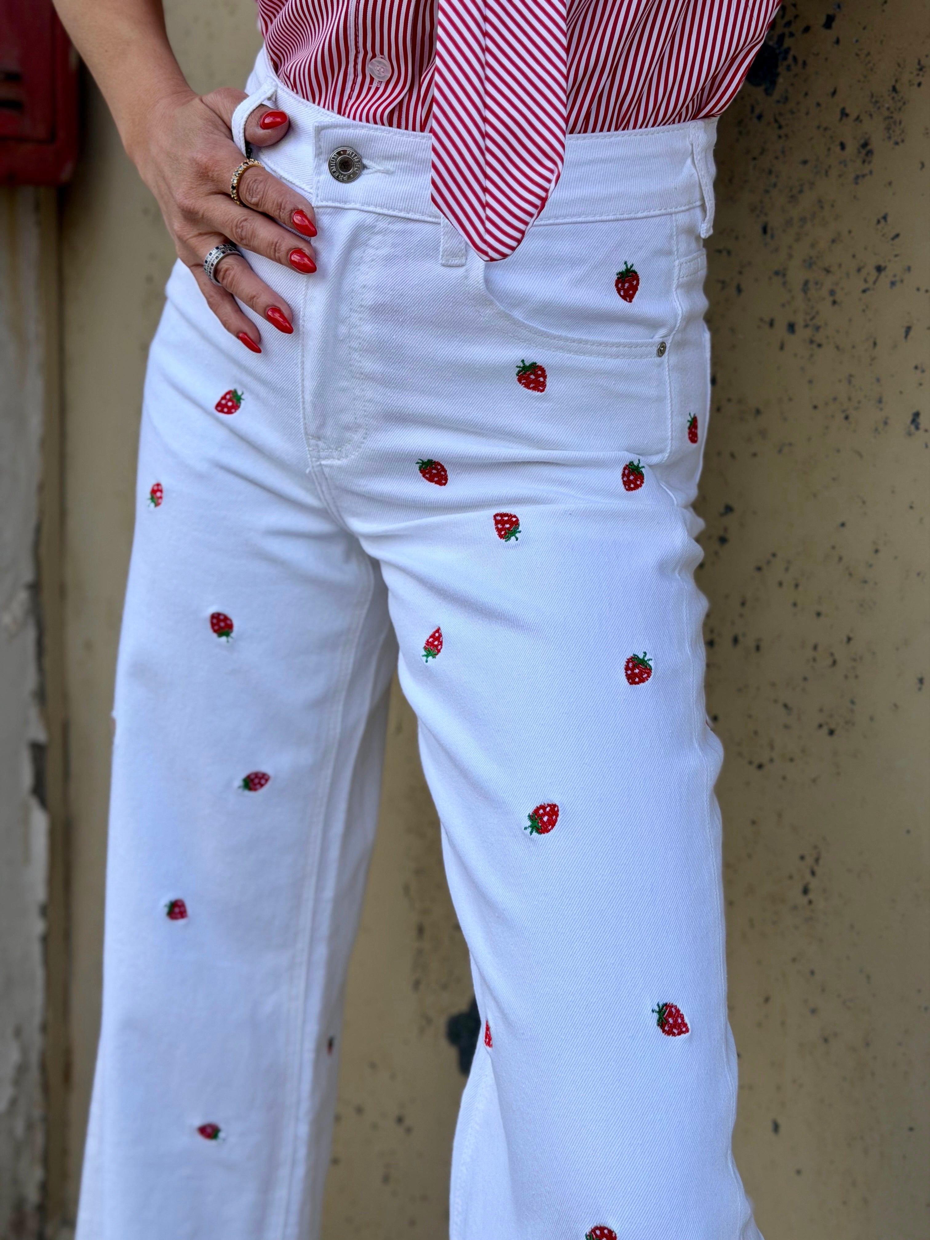 A playful pair of white wide-leg jeans beautifully embroidered with delicate strawberry details throughout. Designed with a flattering high waist and relaxed silhouette, these charming jeans add a fresh, fun twist to classic denim while keeping your look effortlessly chic.