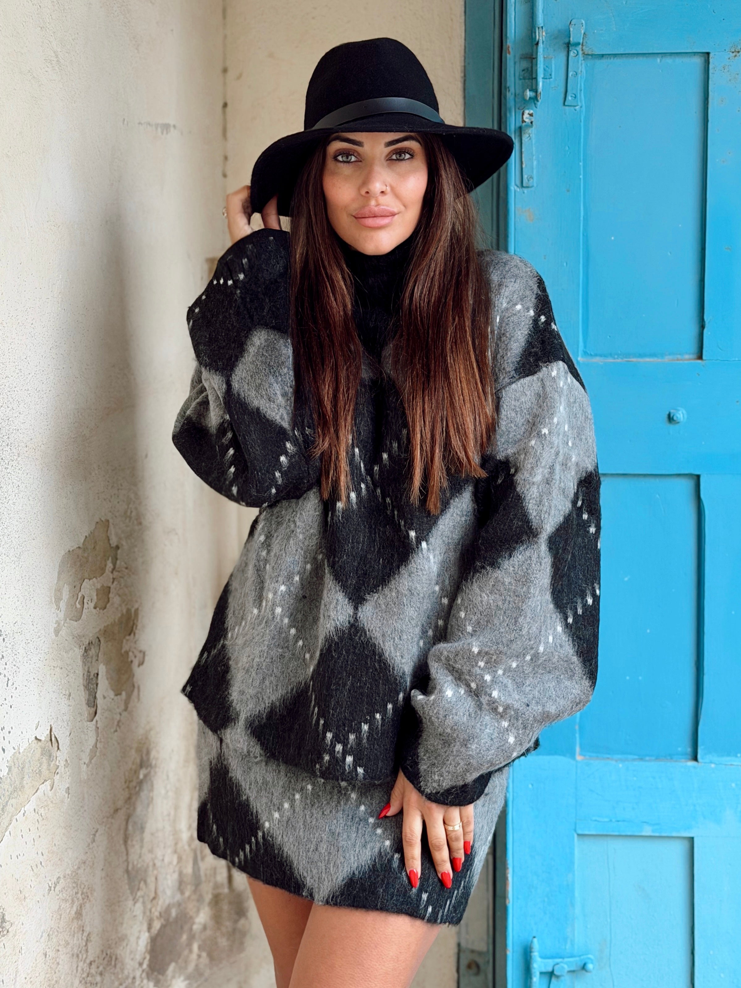 A cosy yet statement-making knit set featuring a soft oversized jumper and matching mini skirt, finished with a bold argyle pattern. Warm, plush and effortlessly chic, this set is perfect for cold days when you want comfort without compromising on style.