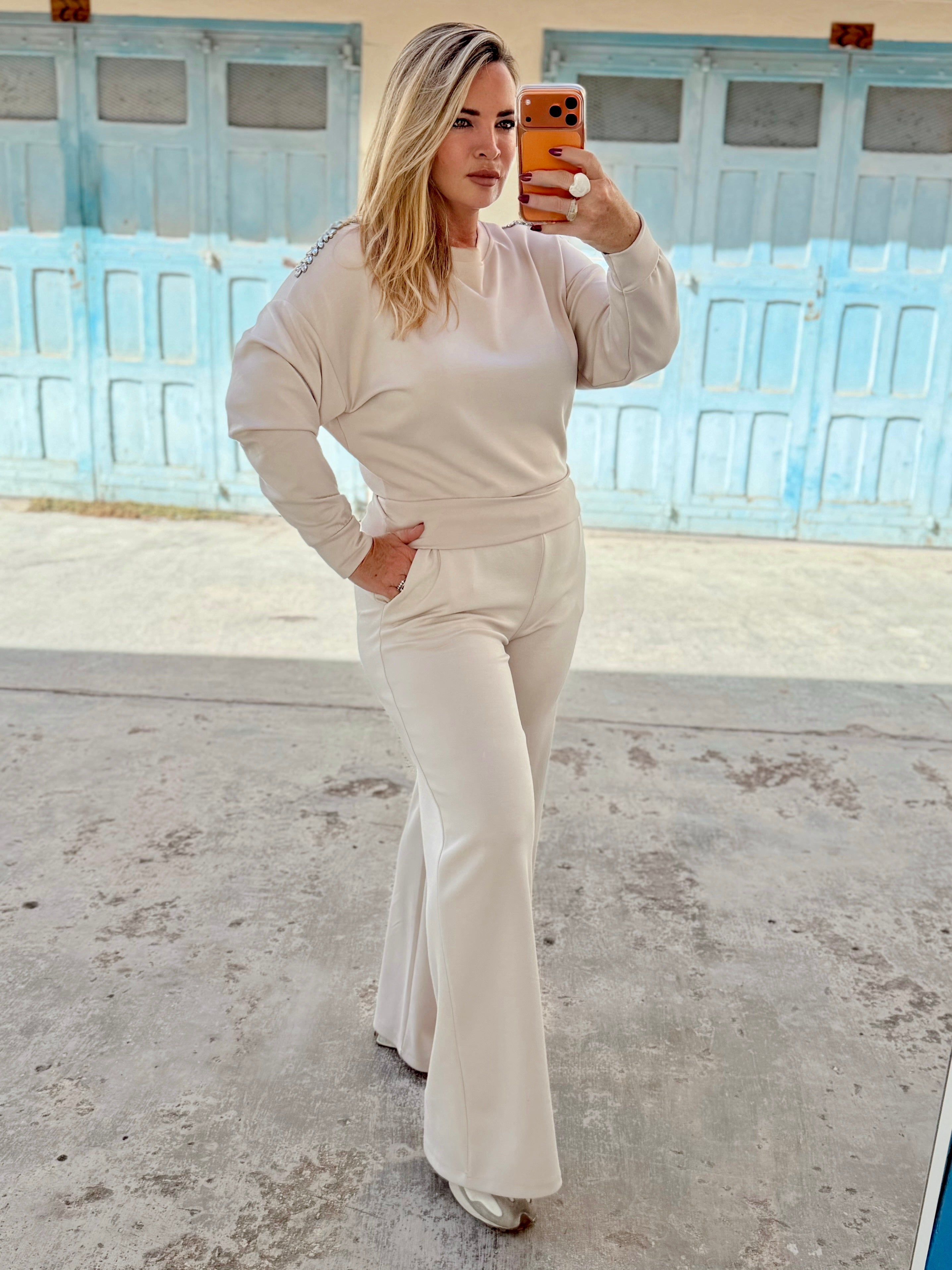 An ultra soft tracksuit with diamond embellishments on shoulders and plain trousers to match