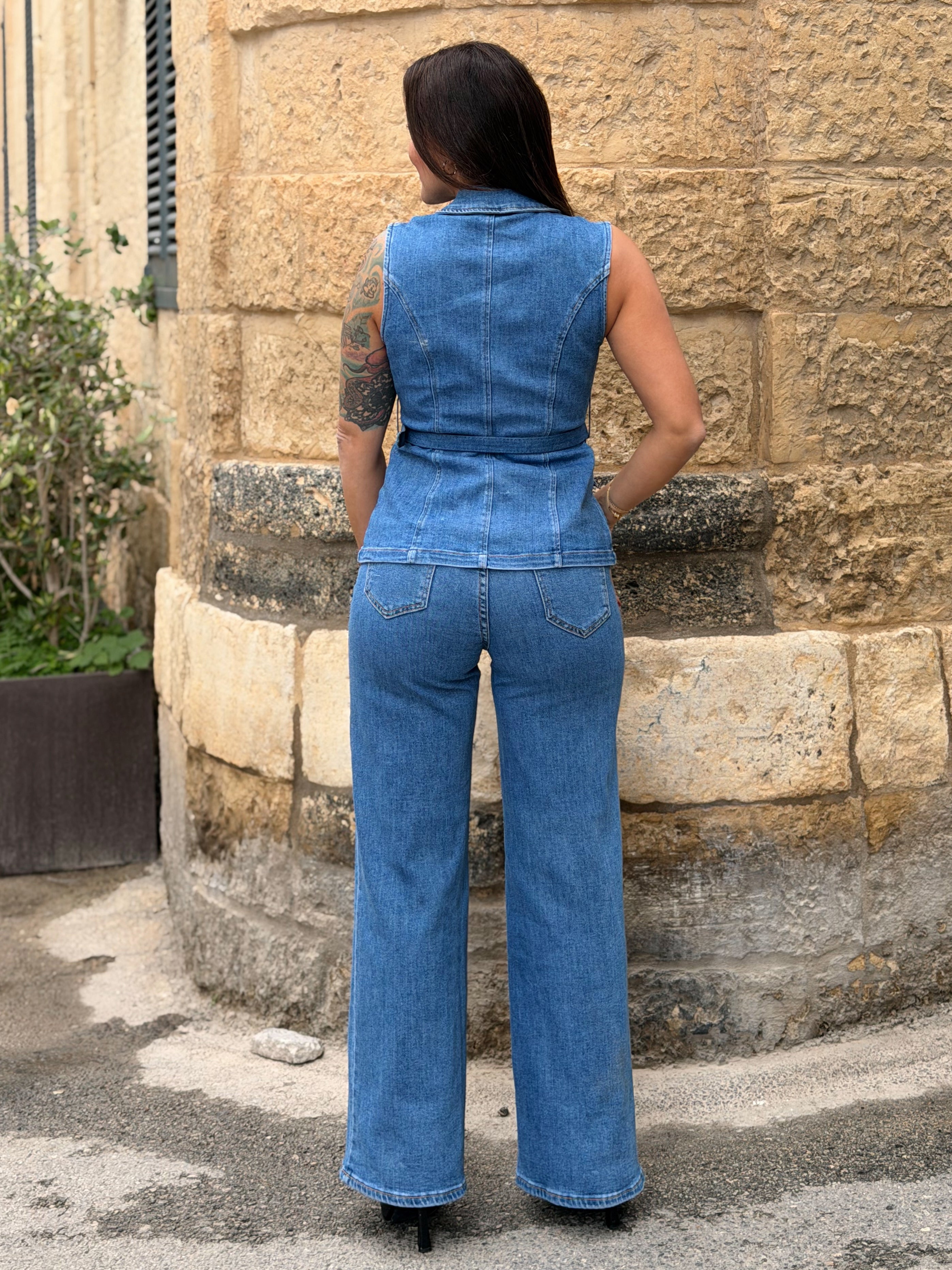 A high-end denim set designed to sculpt and elevate everyday style with a refined tailored silhouette. Featuring a structured sleeveless denim blazer with statement gold buttons and a striking floral buckle belt, paired with flattering wide-leg jeans for an elongated, polished look. Crafted from premium stretch denim, this set blends modern power dressing with effortless Italian-inspired glamour β perfect for chic daywear or elevated evening styling.