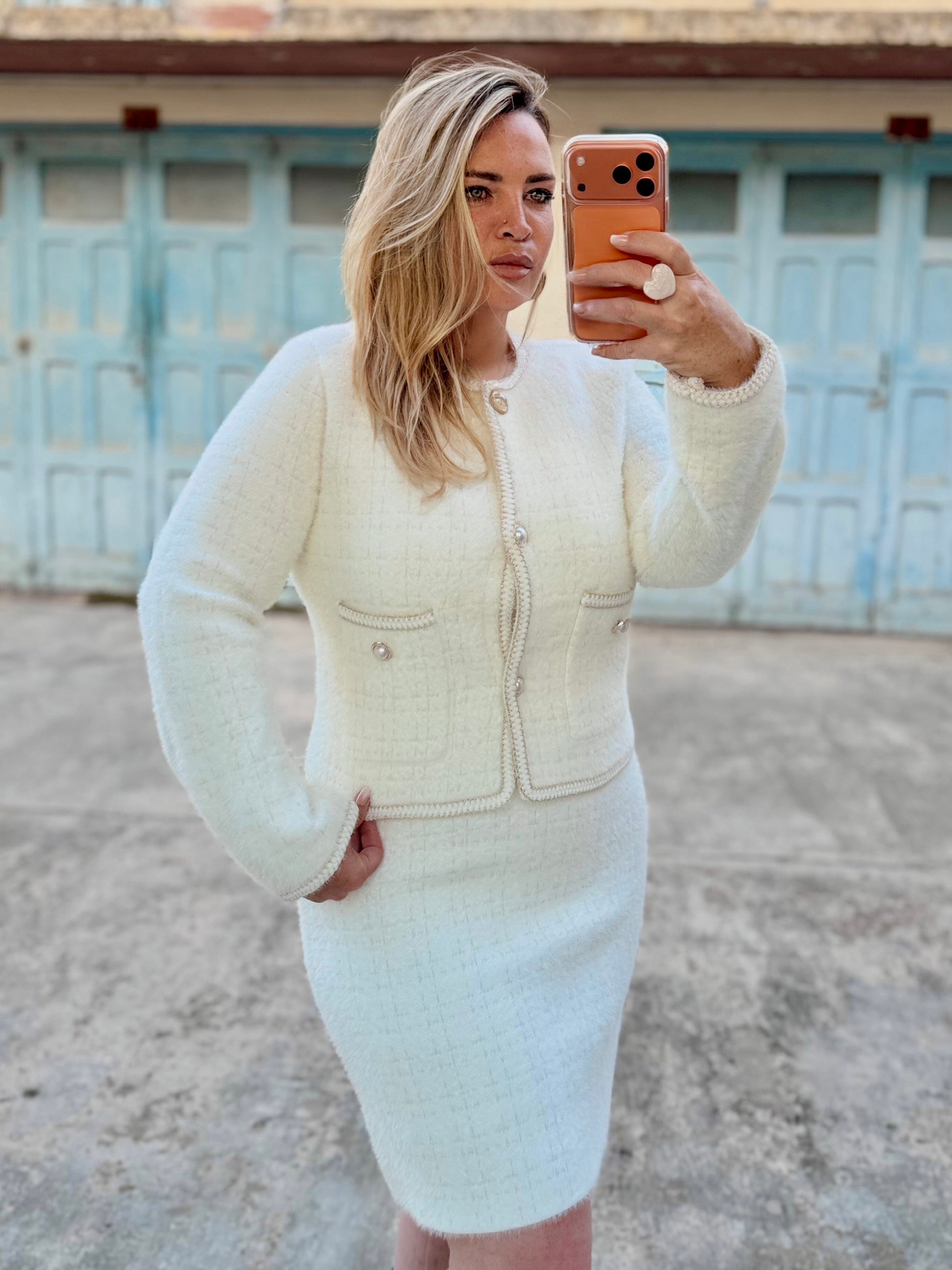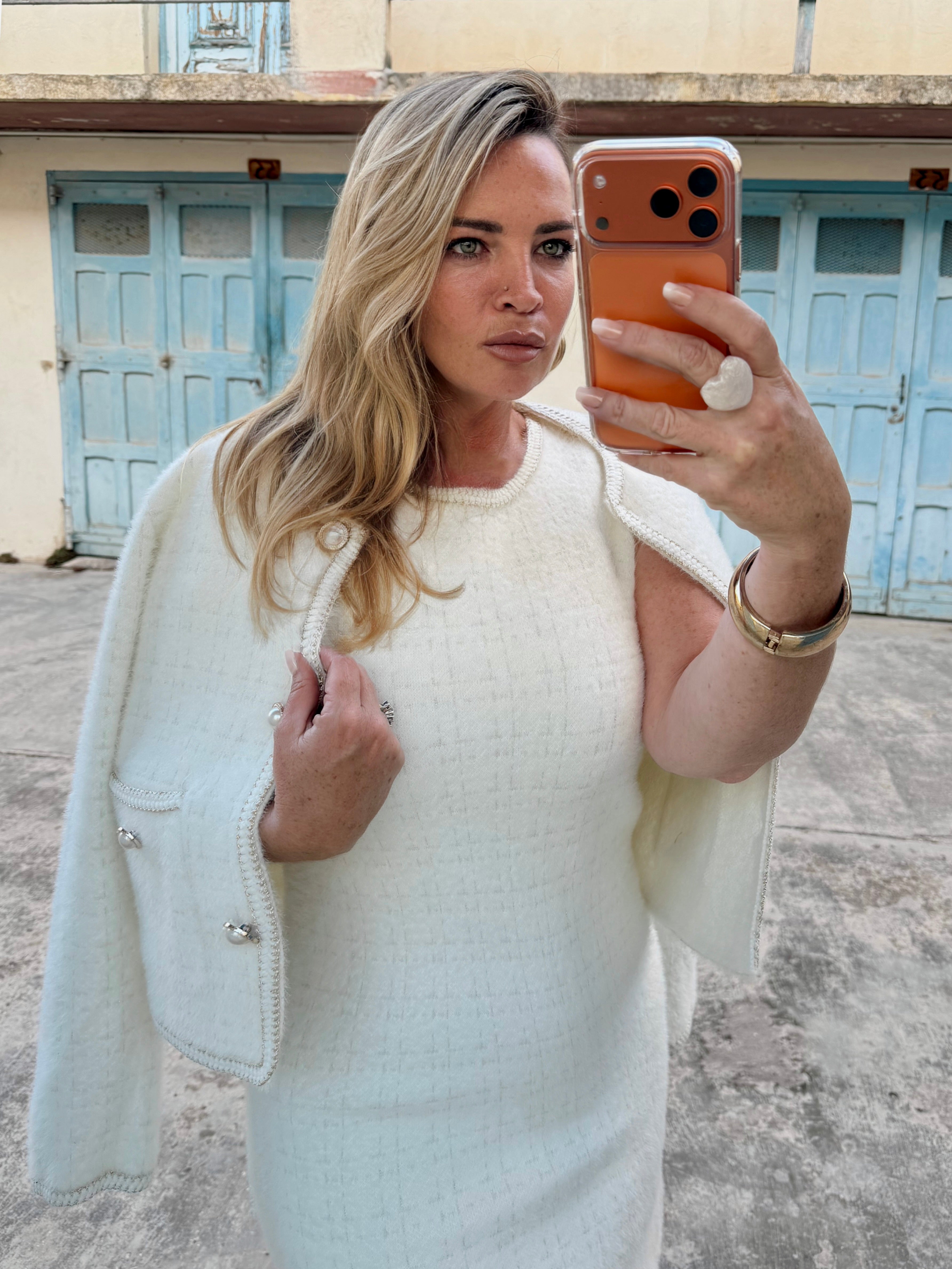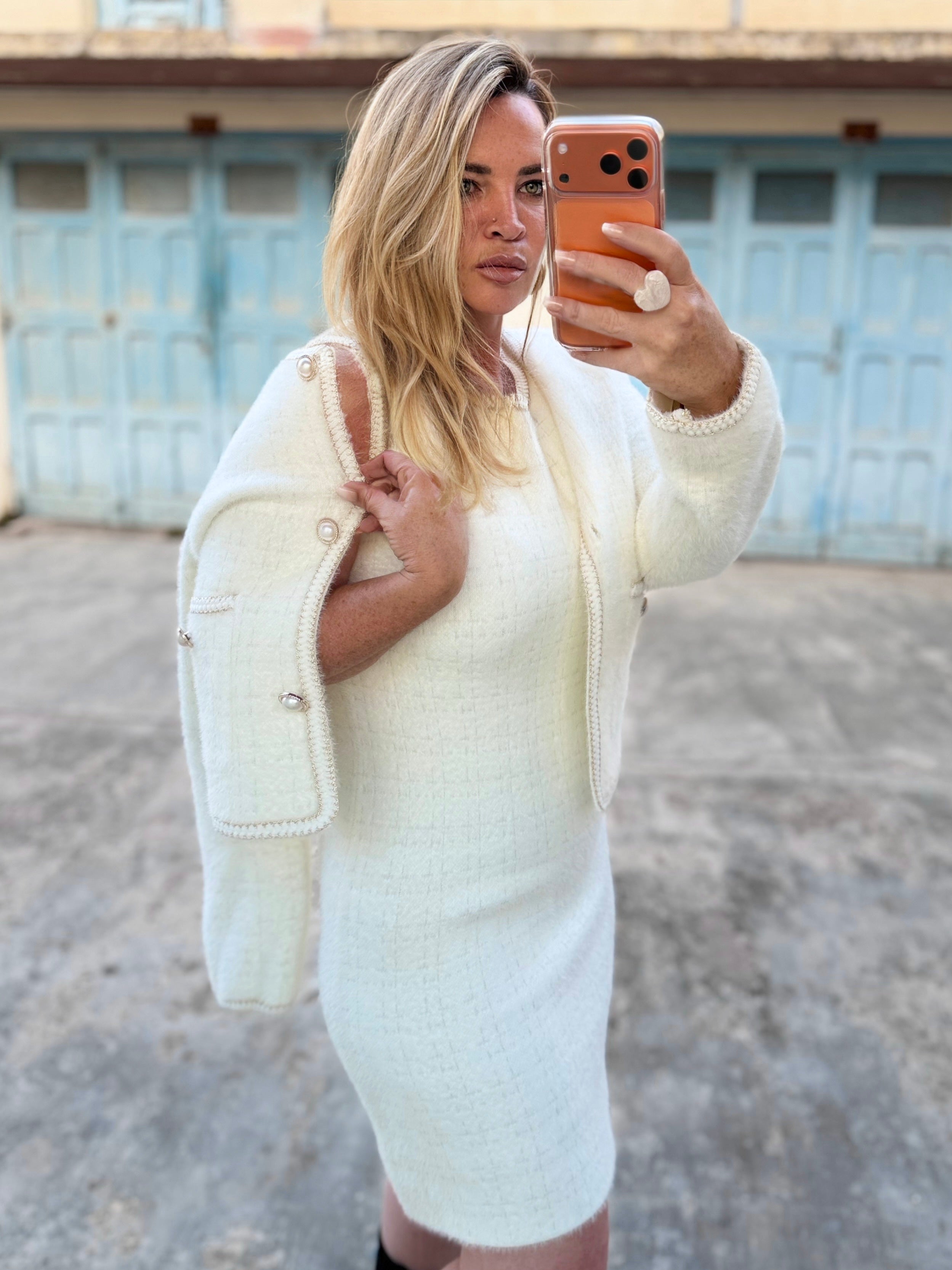 A warm shift dress with matching cardi jacket
