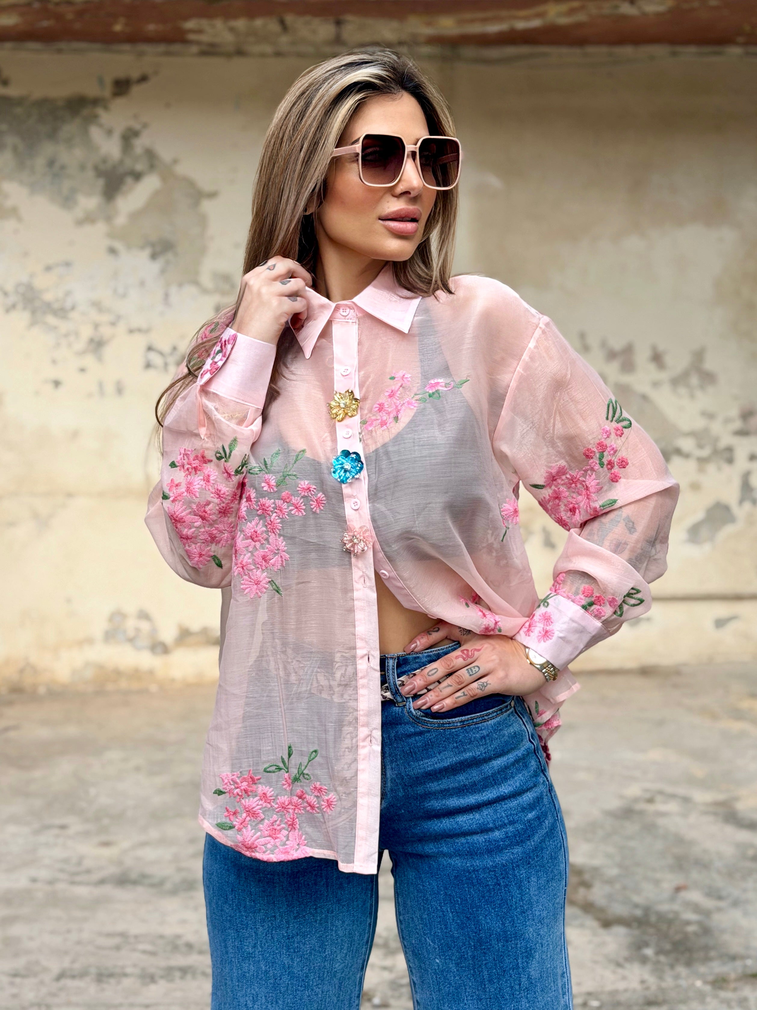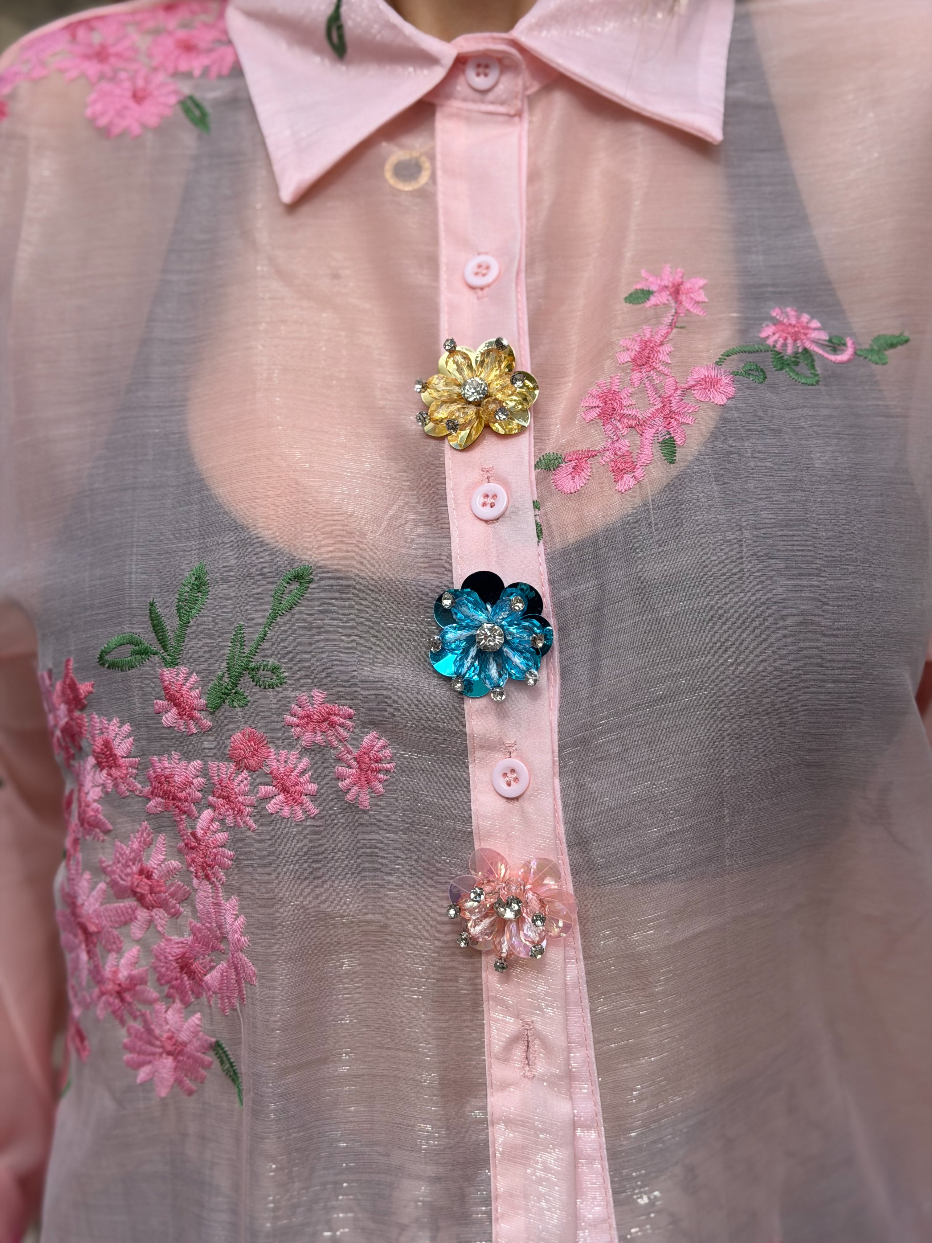 A delicate statement shirt crafted in sheer lightweight fabric, beautifully adorned with romantic floral embroidery and jewel-inspired embellished buttons for a couture finish. Soft, feminine and effortlessly elegant, the Rosé Jardin shirt adds a touch of luxury and sophistication to any look — perfect styled casually with denim or elevated for chic occasion wear.