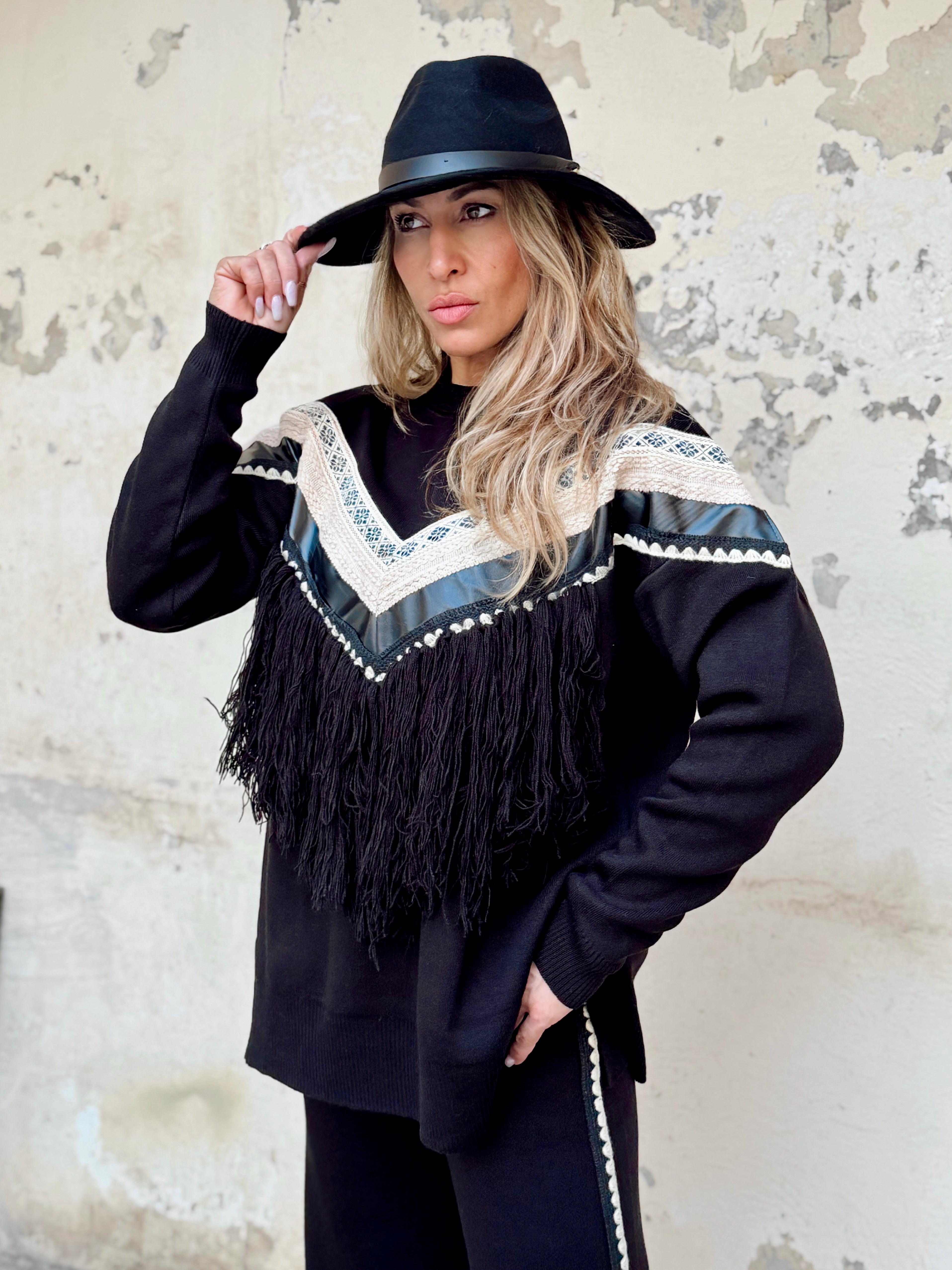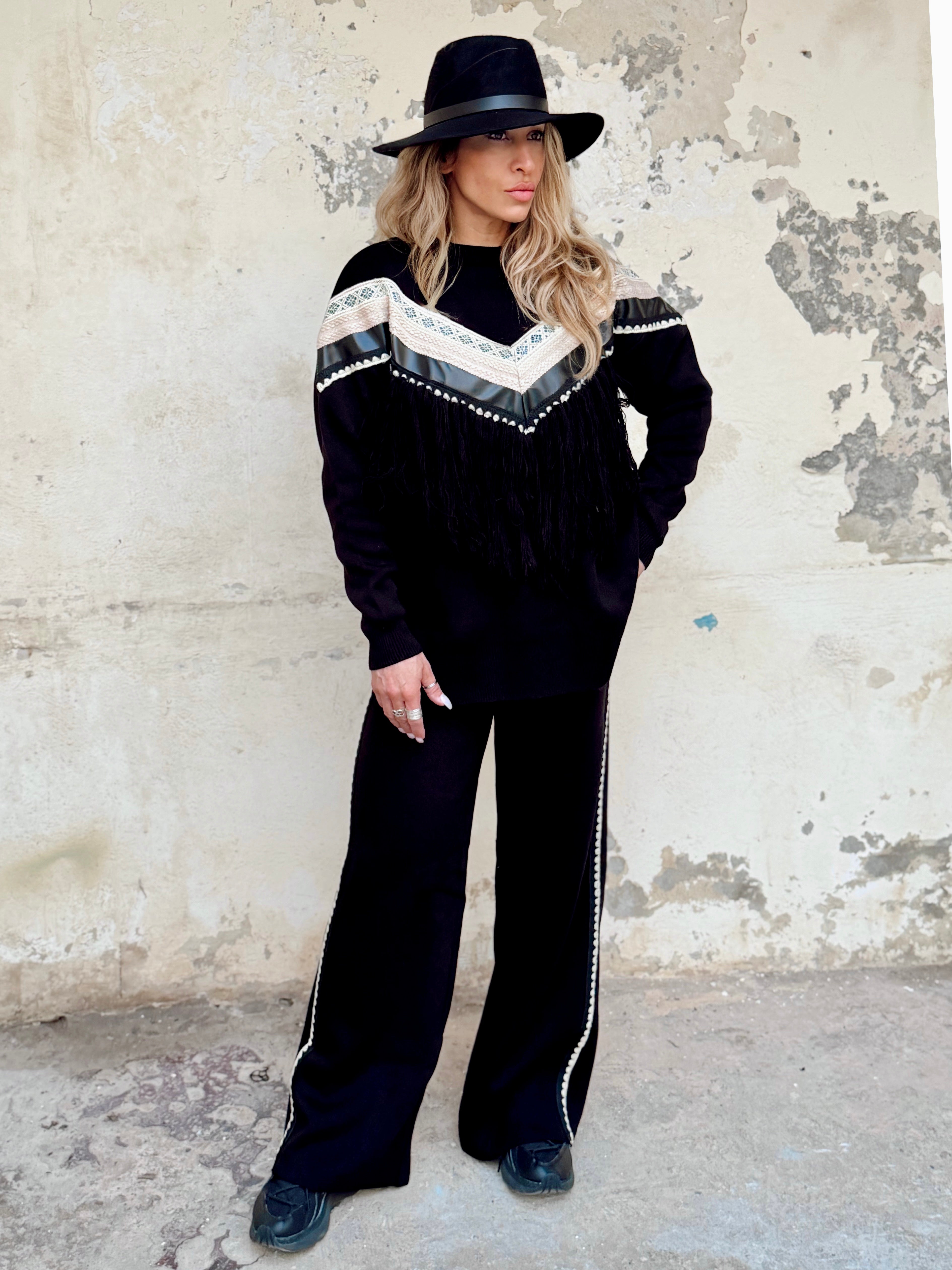 A statement knit set crafted for the modern muse. The relaxed sweater features a striking V-panel with contrast braid trims, faux-leather detailing and cascading fringe for a touch of Western luxury. Paired with wide-leg knit trousers finished with matching side braid accents, this set blends comfort with couture attitude. Effortlessly chic, endlessly unique.