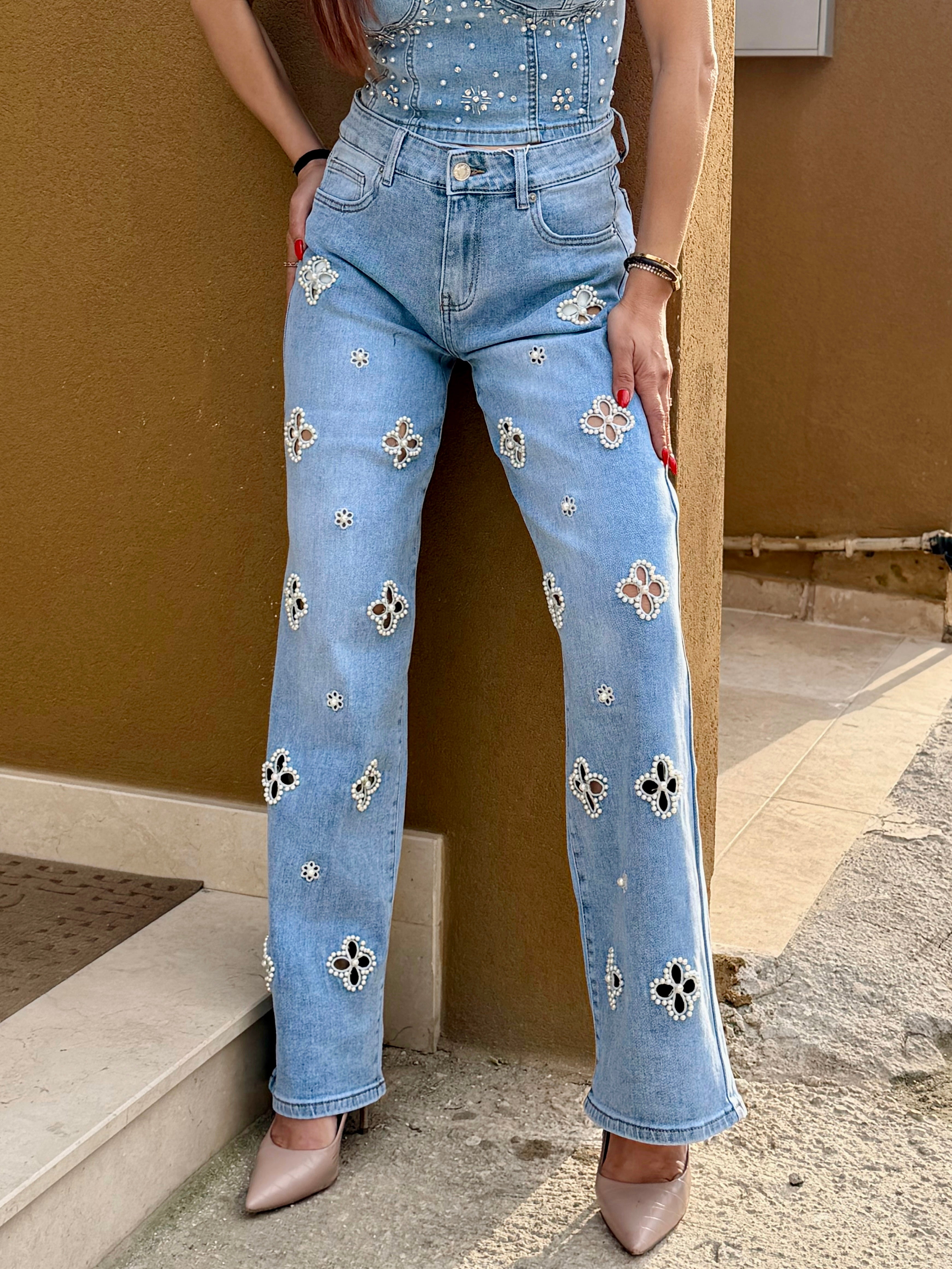 A stunning pair of light-wash denim jeans beautifully adorned with intricate floral jewel embellishments throughout. Designed with a flattering high-waist and straight-leg silhouette, these statement jeans blend classic denim with elegant detailing to create a truly eye-catching, feminine look.