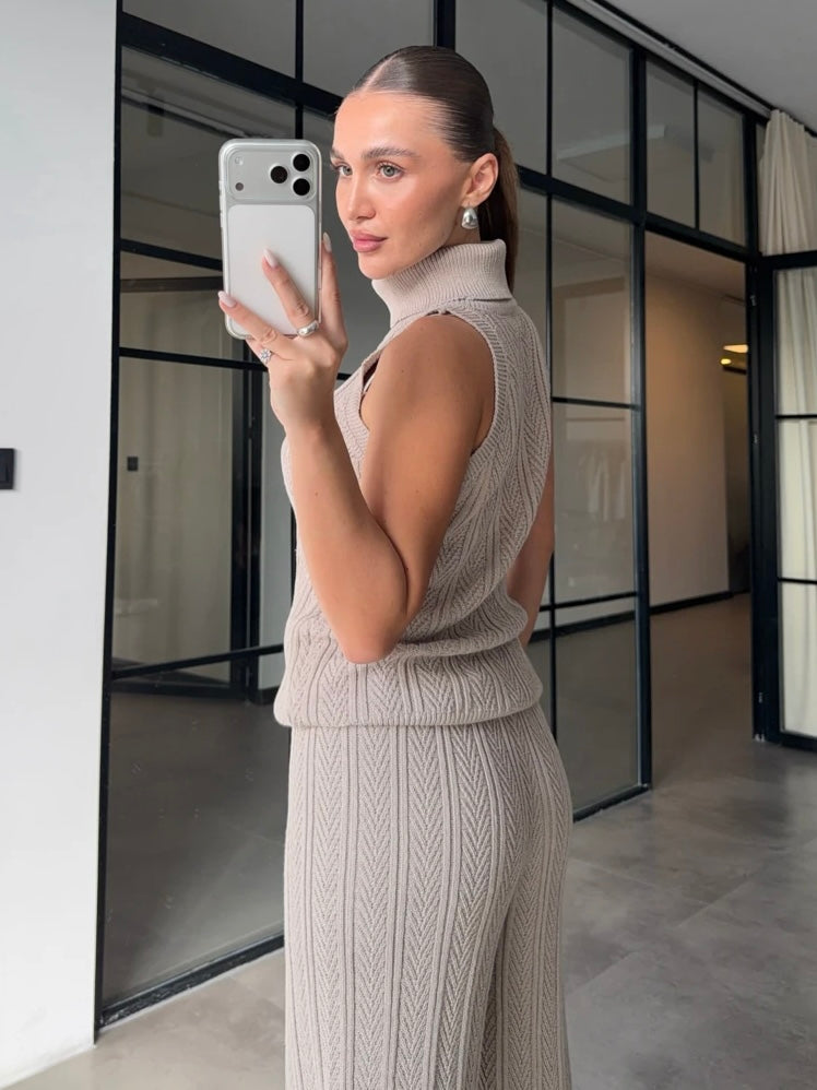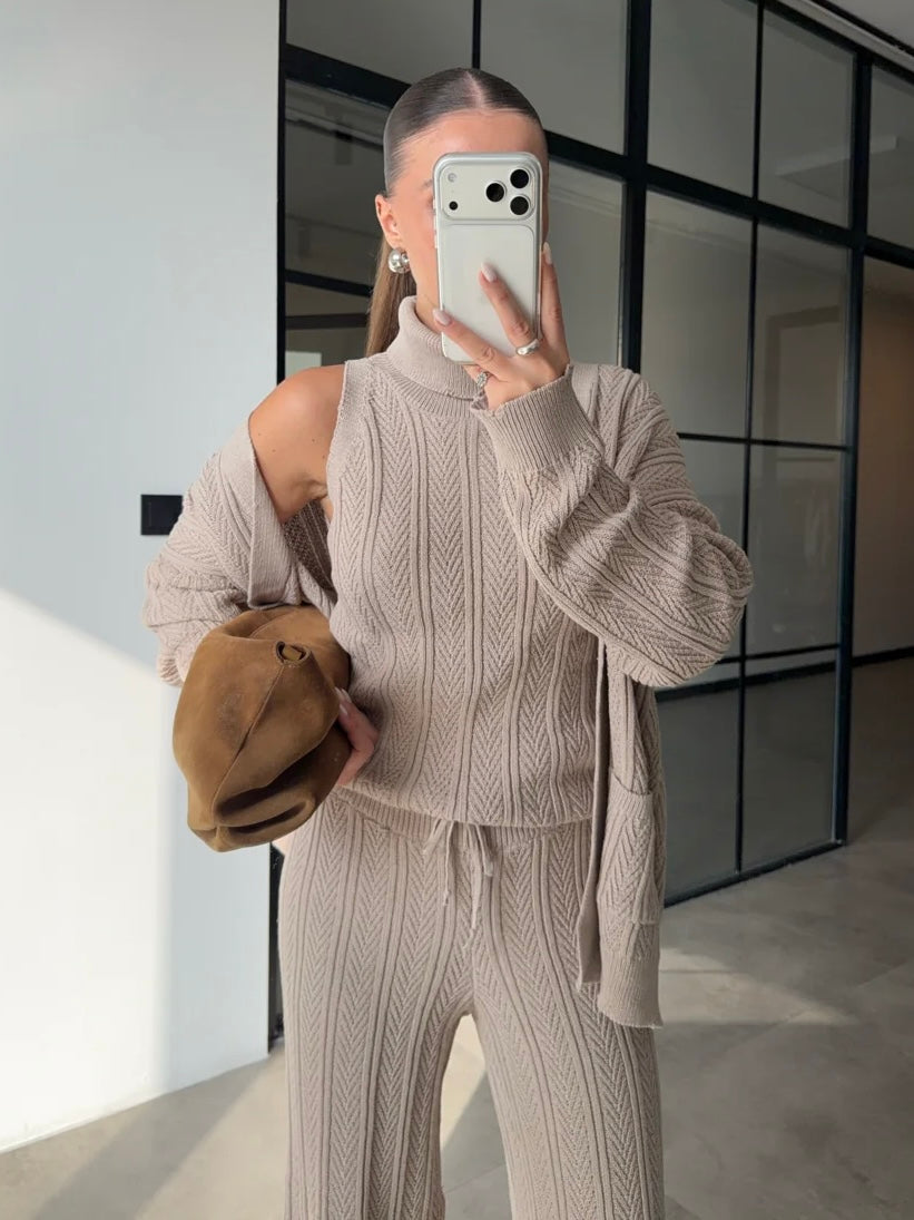 A refined 3-piece knit set designed for effortless elegance. Crafted in a soft herringbone cable knit, it features a sleeveless roll-neck top, relaxed wide-leg trousers with a flattering drape, and a matching slouchy cardigan for layered luxury. Cozy yet polished, this set delivers a timeless silhouette meant for chic everyday comfort.