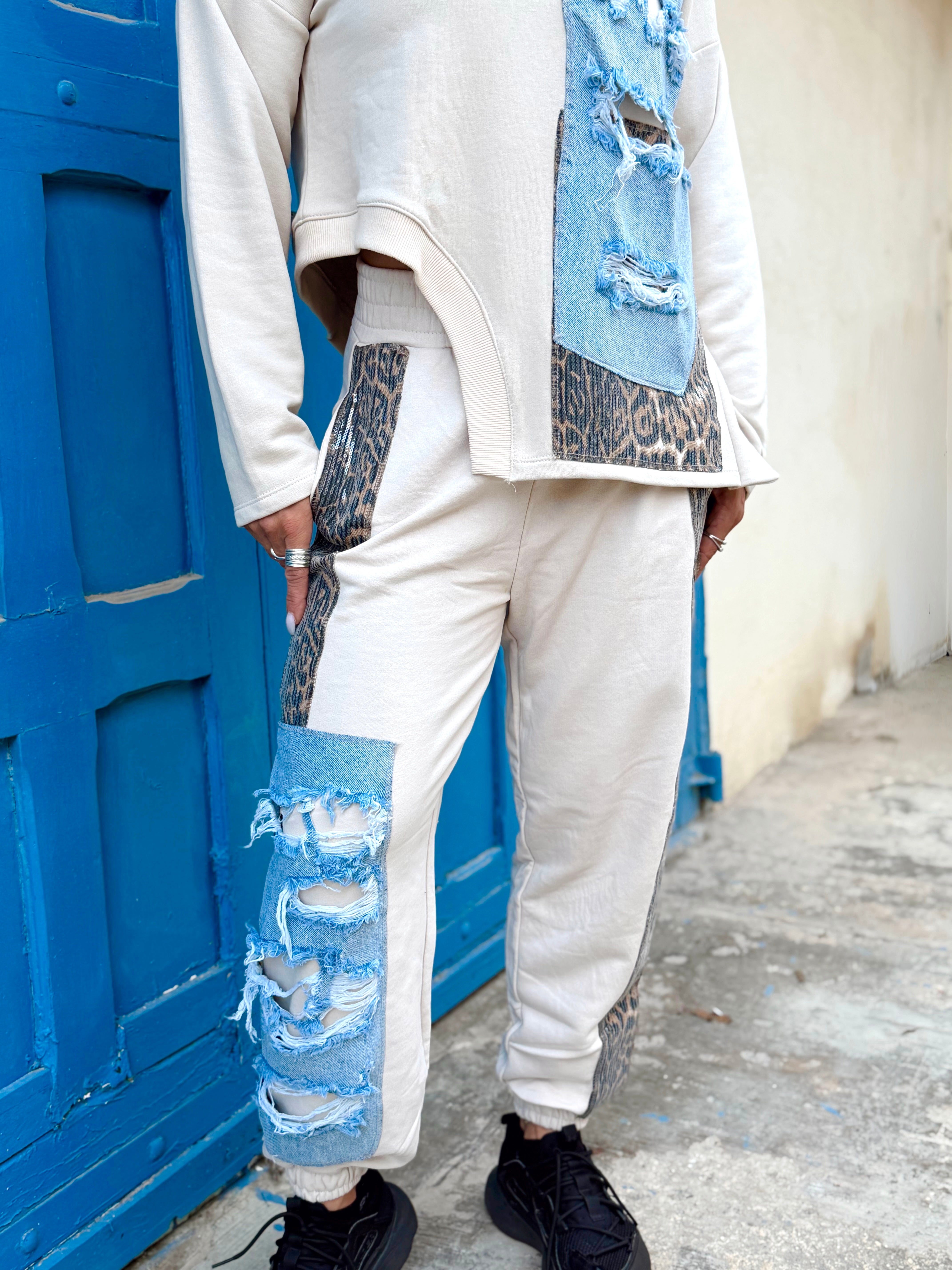 A bold, art-driven tracksuit that fuses raw denim texture with luxe animal-print accents. The asymmetrical sweatshirt features distressed denim panels layered over leopard jacquard for a sculptural statement effect. Paired with joggers detailed with matching patchwork, shredded denim appliqué and contrast insets, it creates a fearless street-couture look. Unique, daring, and made for the woman who commands attention.