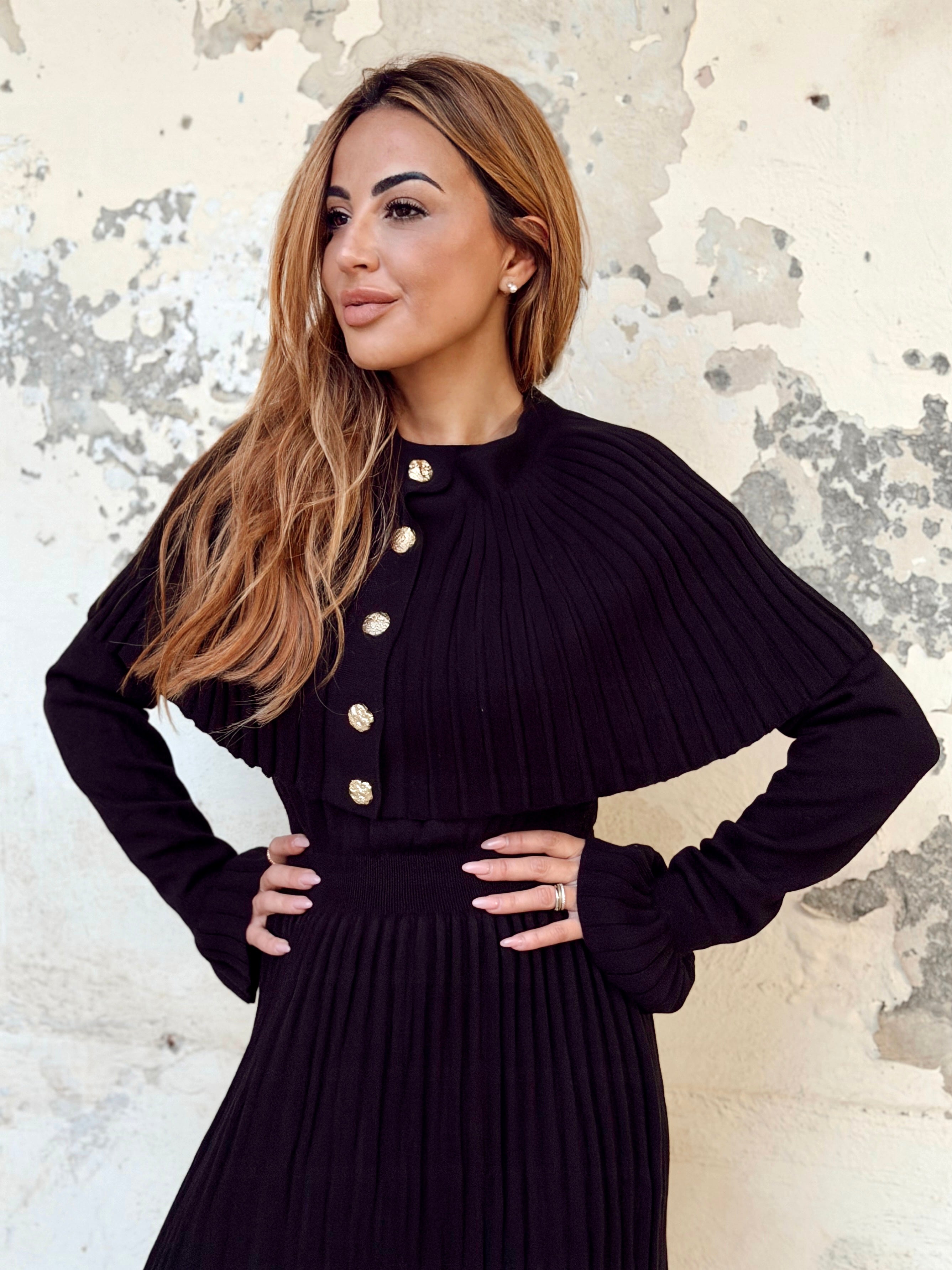 A beautifully refined knit dress paired with a matching pleated cape overlay. Featuring a fitted waist, flowing pleated skirt and gold-button accents, this elegant two-piece creates a timeless silhouette with modern sophistication — perfect for winter occasions and chic daytime styling.