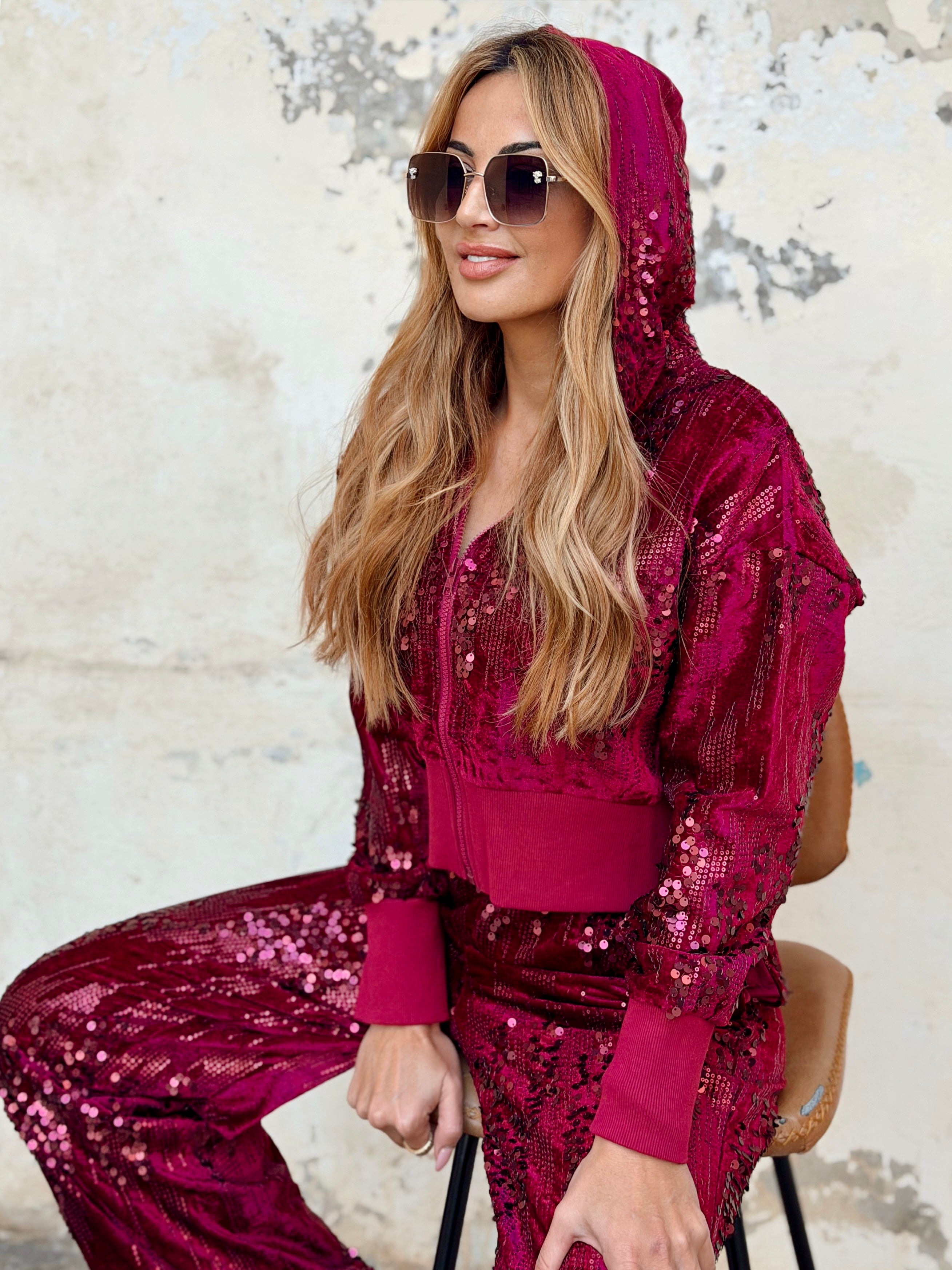 A statement festive tracksuit dripping in tonal sequins, featuring a hooded zip-up jacket and relaxed matching trousers. The rich ruby hue and all-over shimmer deliver a luxe, modern party look with maximum comfort. Perfect for holiday nights, cozy glam dinners, or sparkling casual chic.