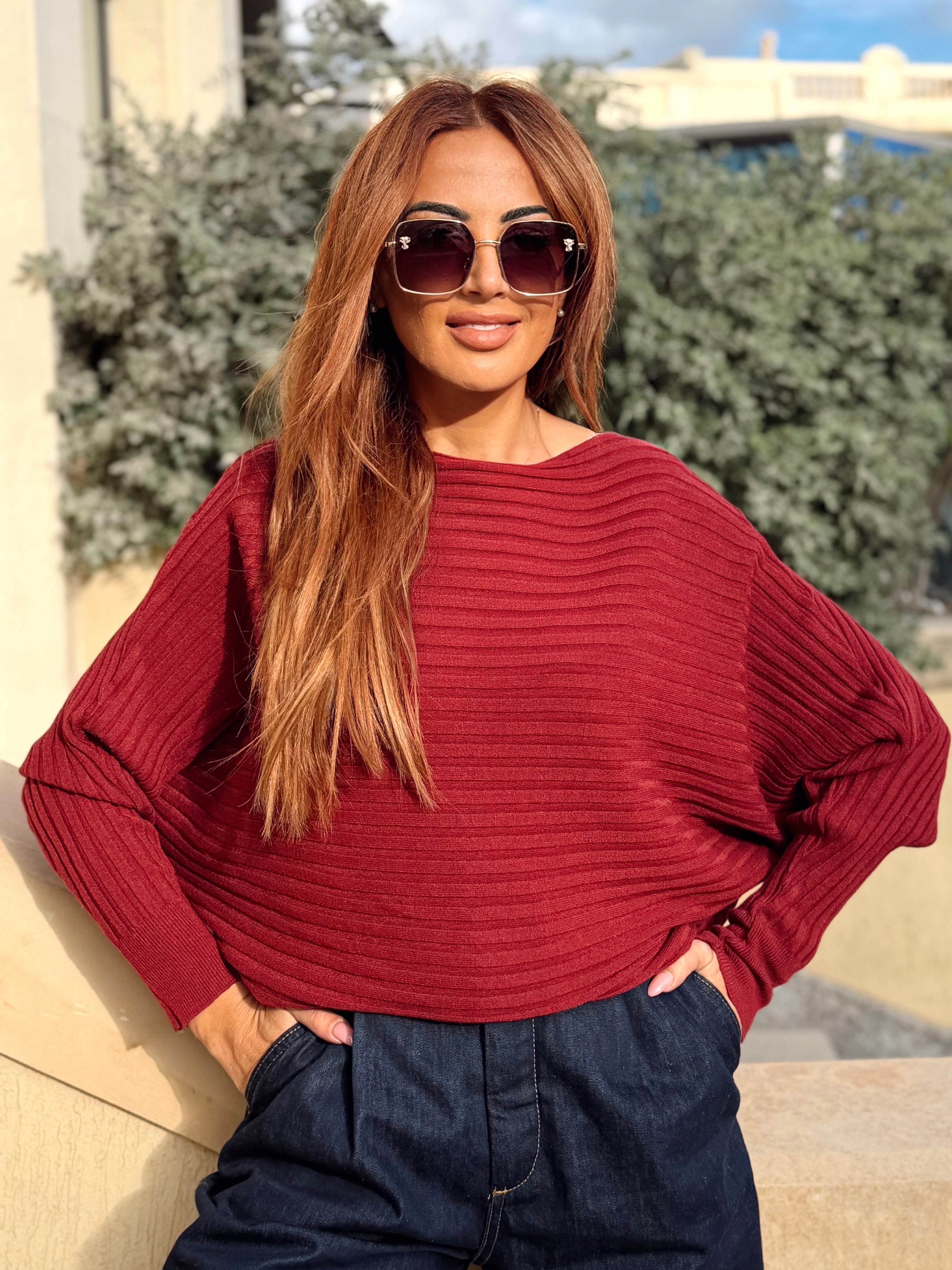 An ultra-soft, lightweight knit sweater designed with a relaxed batwing silhouette and subtle ribbed texture throughout.