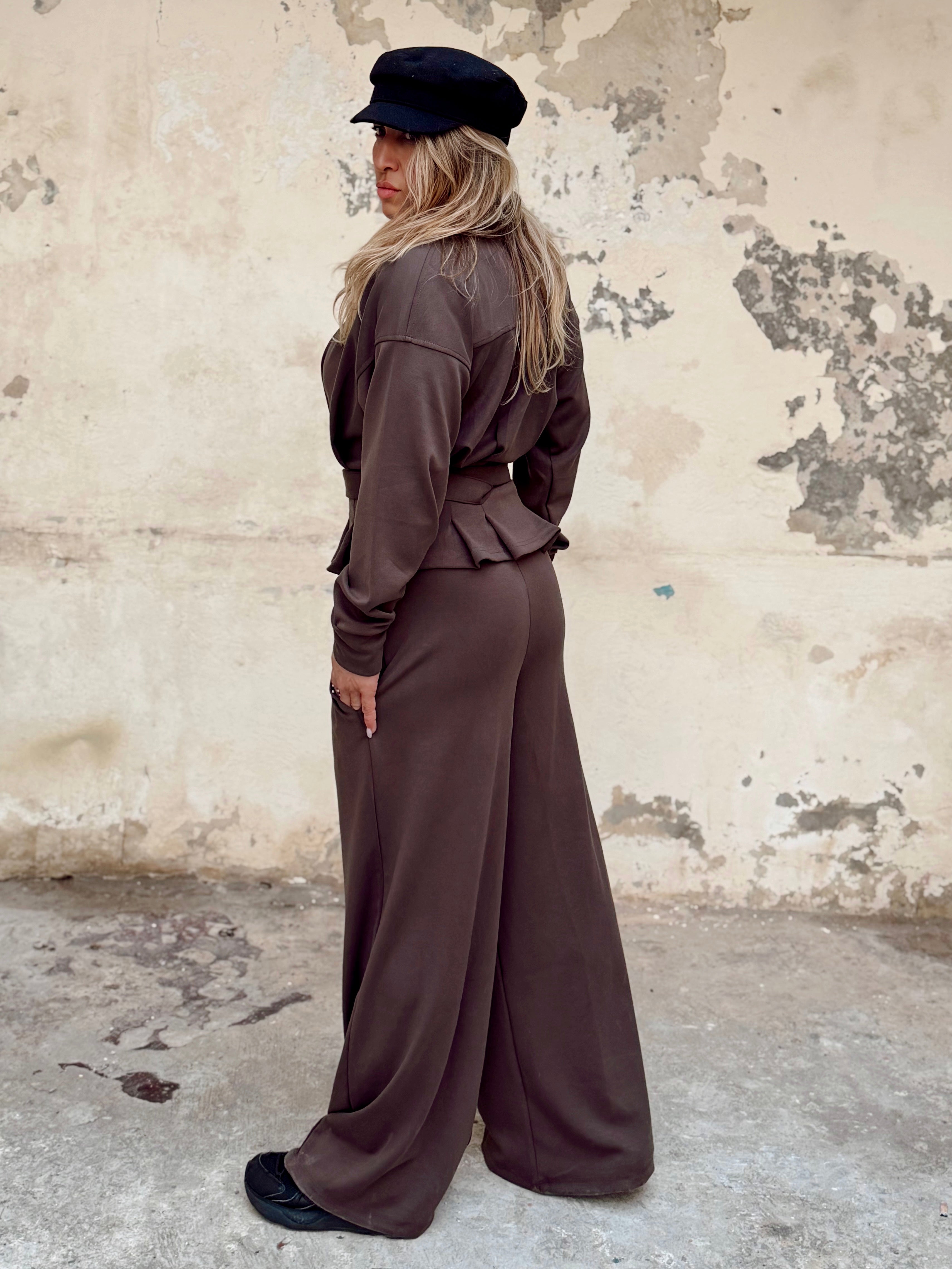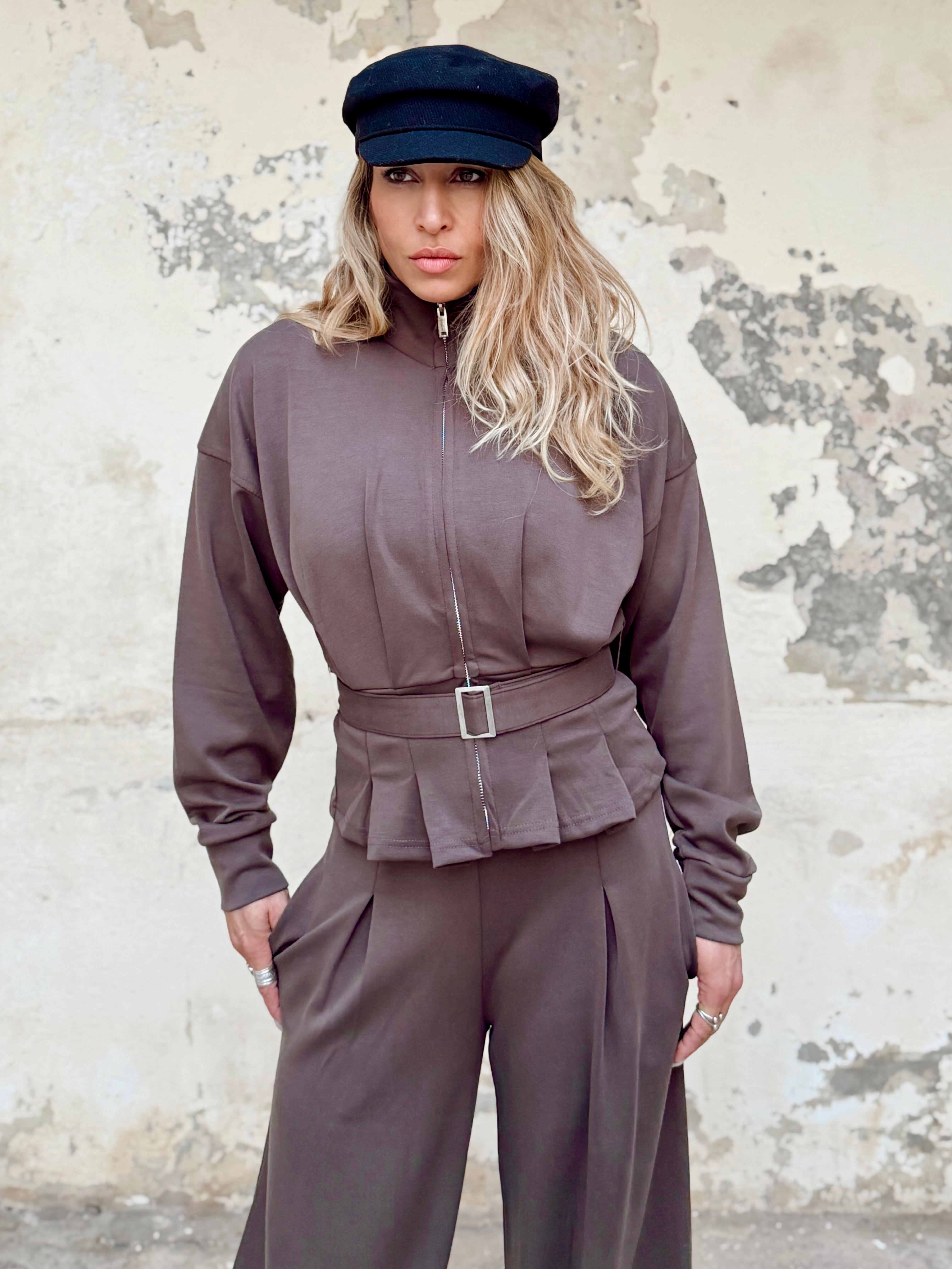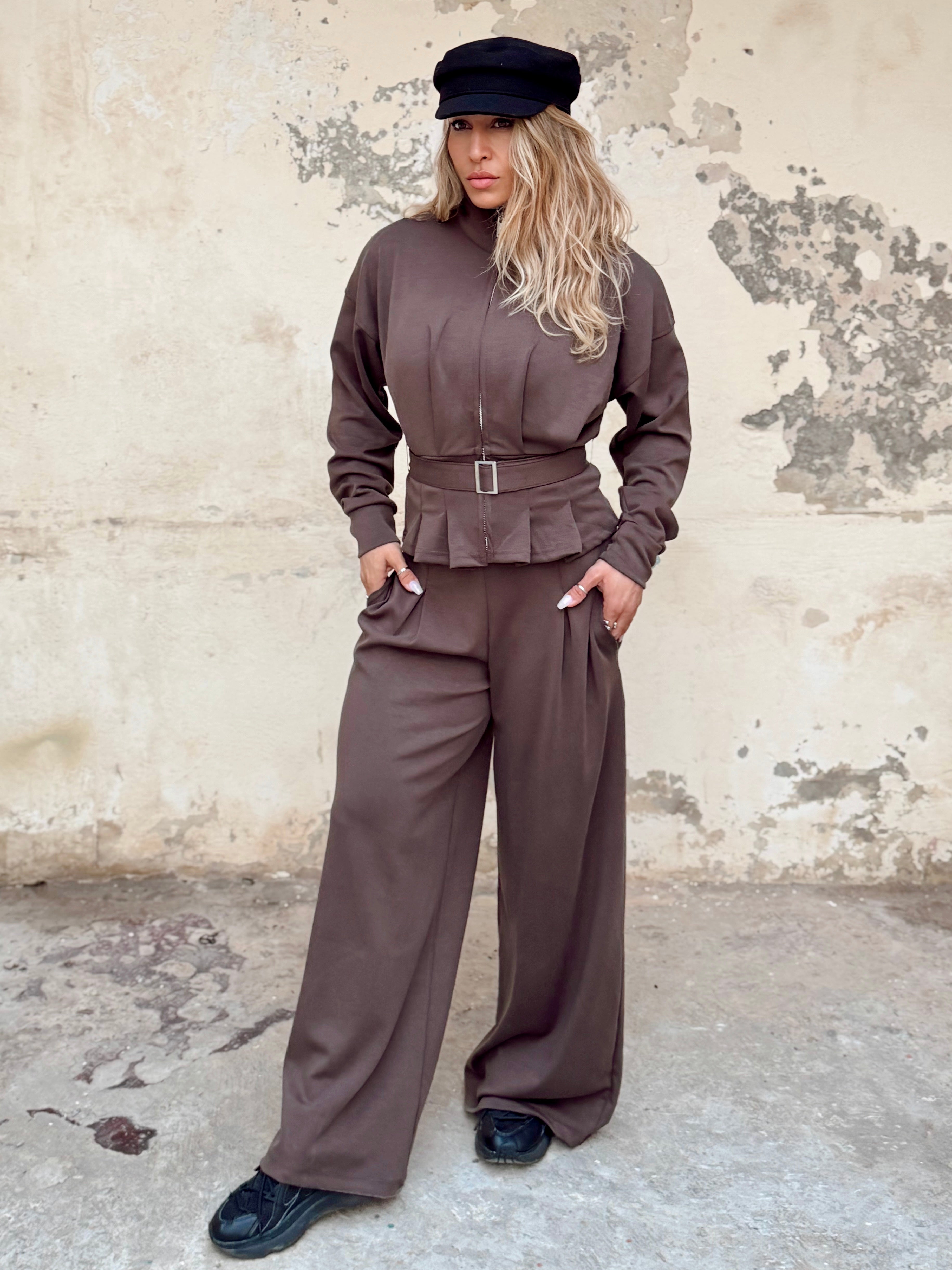 A couture-inspired tracksuit with a sculpted, tailored edge. The zip-front top features structured pleats, a cinched belt with metal buckle, and a softly draped peplum hem that shapes the waist. Paired with wide-leg trousers for an effortless fall, it delivers comfort with the polish of a designer silhouette. Minimal, refined, and made for elevated everyday wear.